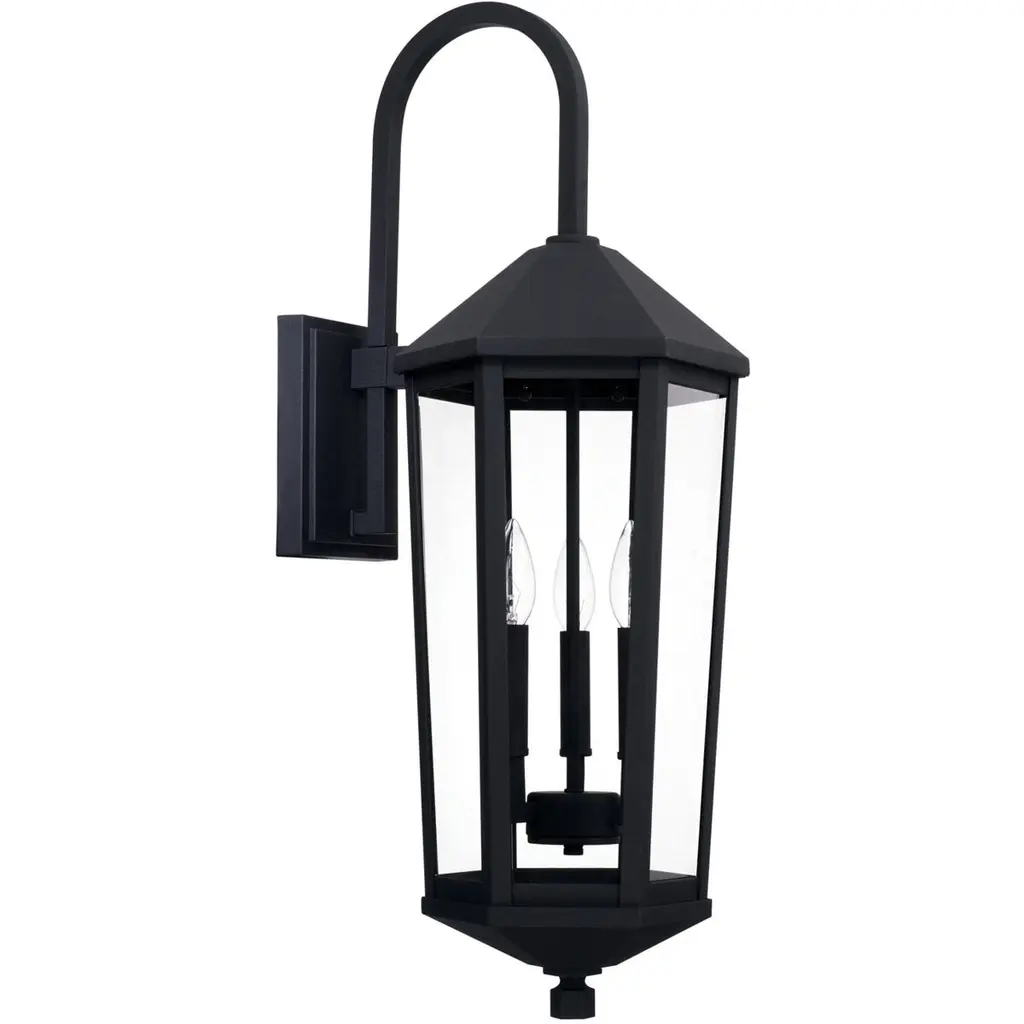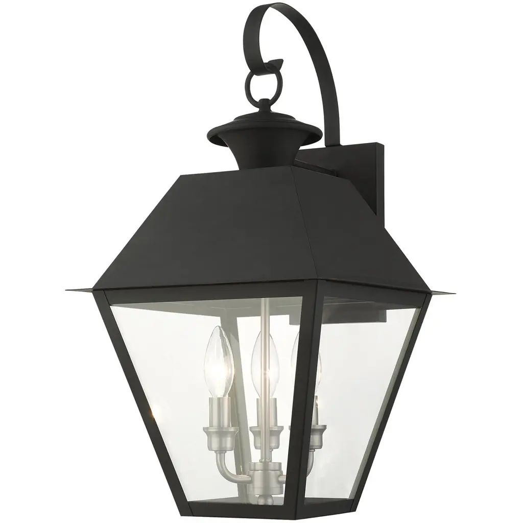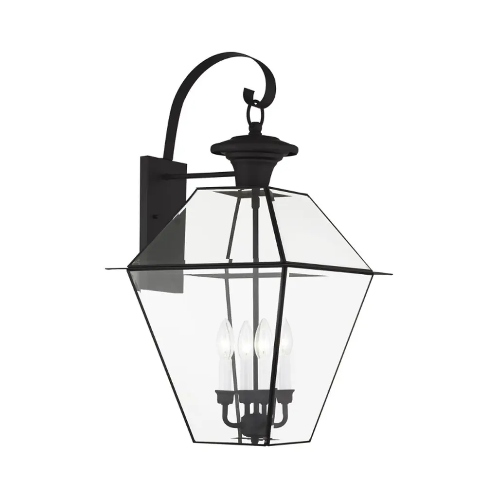 Collection: Westover, Material: Brass, Finish Color: Black, Width: 12", Height: 23.25", Depth: 13", Height From Outlet Box: 10", Backplate Width: 4.5", Backplate Length: 8", Lamping Type: Incandescent, Number Of Bulbs: 3, Wattage: 60 Watts, Moisture Rating: Dry Rated, Desc: Inspired by the historic look and romantic feel of gas-burning lamps, the Westover collection is reminiscent of antique gas lights still popular in Southern cities like Charleston and New Orleans. This solid brass piece features three lights behind large panes of clear beveled glass.,