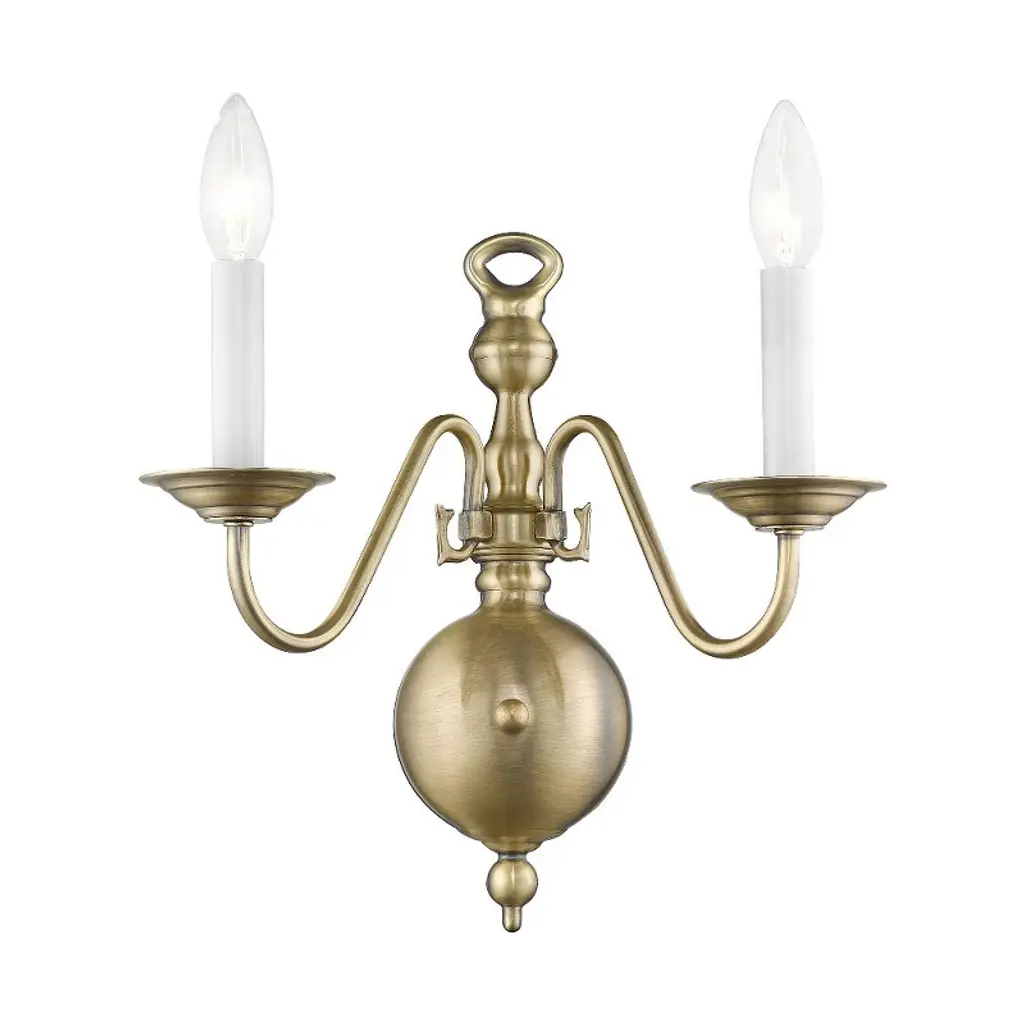 Collection: Williamsburgh, Material: Steel, Finish Color: Polished Brass, Width: 12.75", Height: 13", Depth: 6.5", Height From Outlet Box: 10", Backplate Width: 4.38", Backplate Length: 13", Lamping Type: Incandescent, Number Of Bulbs: 2, Wattage: 60 Watts, Moisture Rating: Dry Rated, Desc: Simple, yet refined, the traditional, colonial wall sconce is a perennial favorite. Part of the Williamsburgh series, this handsome sconce is a timeless beauty.,