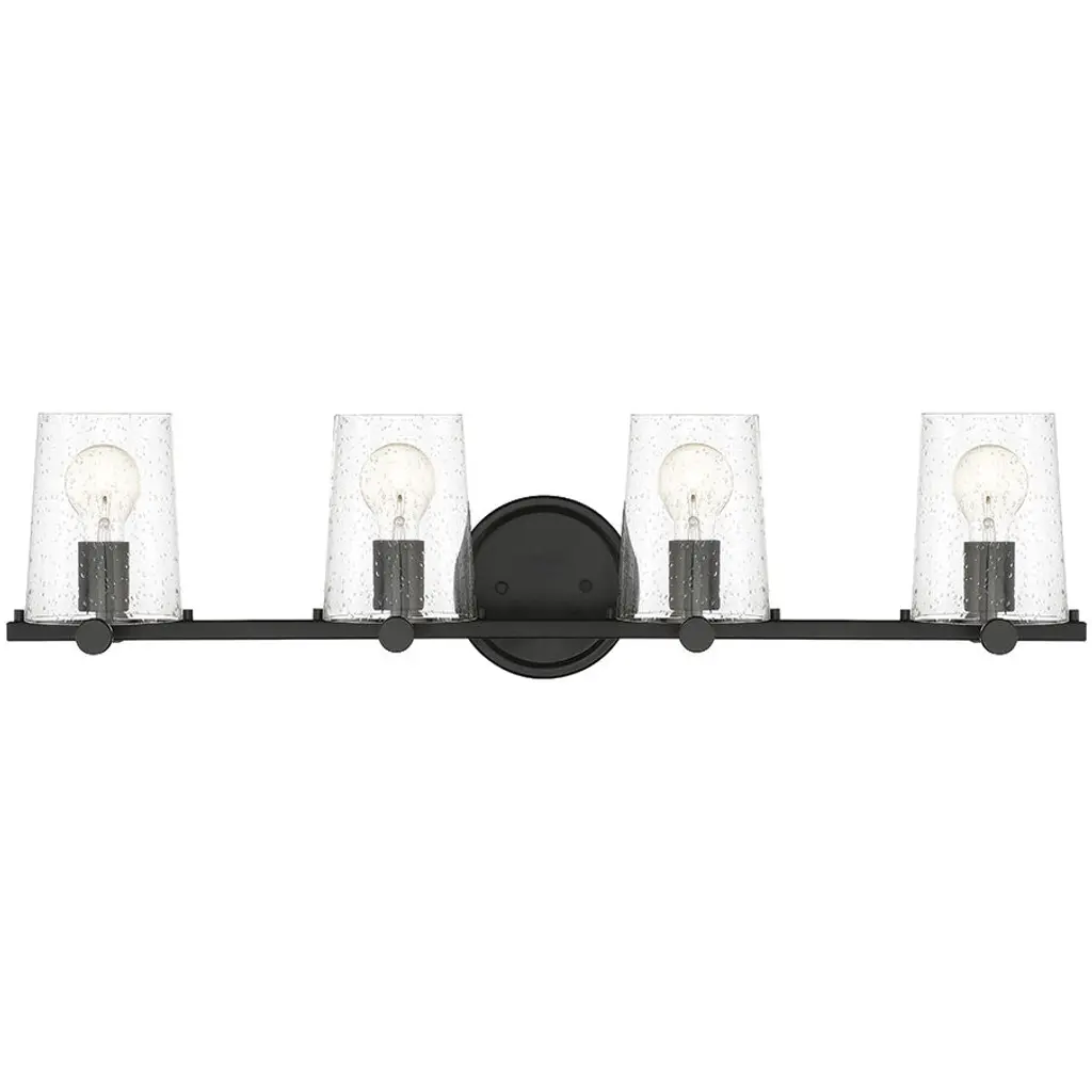 Collection: Zurich, Material: Steel, Finish Color: Black/Brushed Nickel, Width: 35.5", Height: 7.75", Depth: 5", Height From Outlet Box: 5.5", Backplate Width: 45", Backplate Length: 0.75", Lamping Type: Incandescent, Number Of Bulbs: 4, Wattage: 100 Watts, Moisture Rating: Dry Rated, Desc: Illuminate your home with a bright design from the Zurich collection. This four light vanity sconce features a black finish with brushed nickel finish accents and clear seeded glass. Perfect for a contemporary or transitional luxury bathroom, bedroom or hallway setting.,