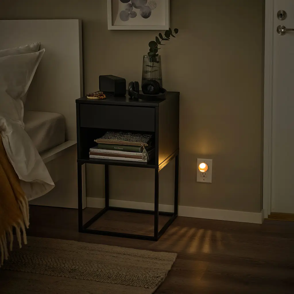 LJUSTER LED night light - white. The nightlight turns on automatically when it’s dark in the room and off when it’s light, so you don’t have to remember to plug it in and take it out every day. The LED light source consumes up to 85% less energy and lasts 20 times longer than incandescent bulbs.