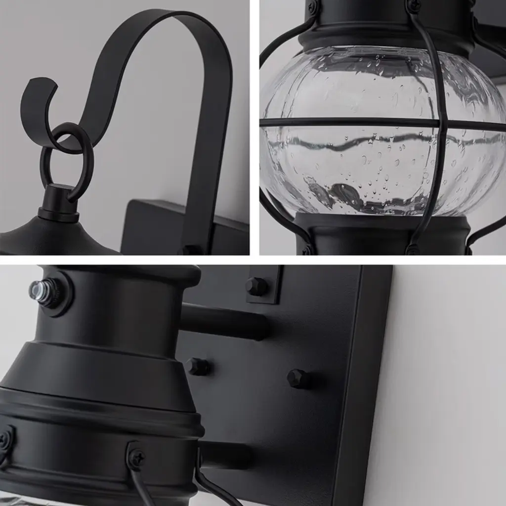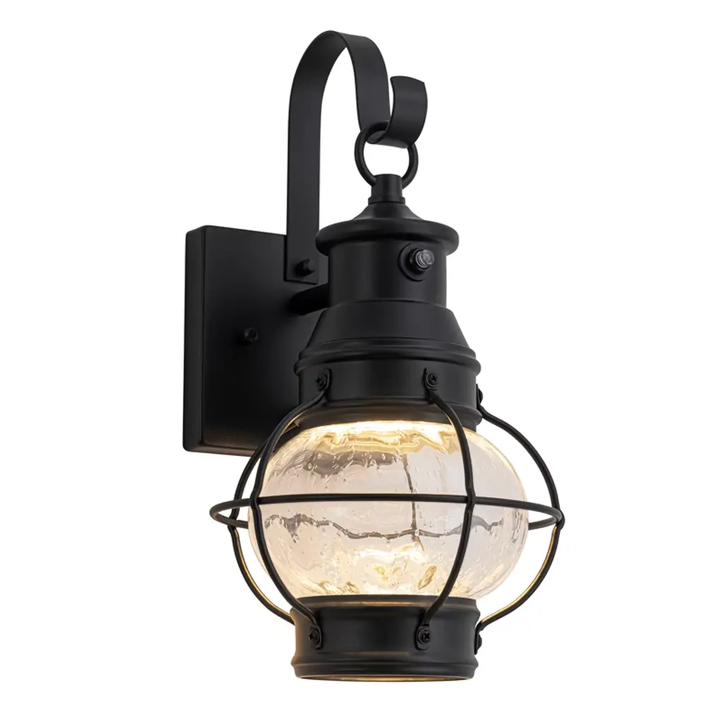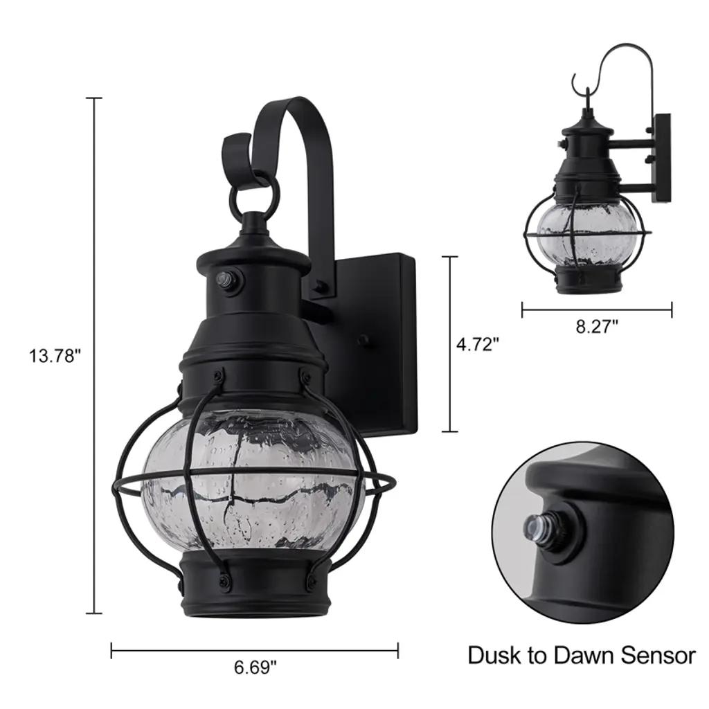 Bring vintage charm and modern convenience to your outdoor space with this lantern-style LED wall light. Designed with a traditional lantern silhouette, this fixture features a sand black metal body paired with rippled clear glass that beautifully diffuses light. The integrated 12W LED emits a cozy 3000K warm white glow at 1200 lumens, with a CRI of 80 for accurate color rendering¡ªideal for porch, patio, garage, or entry lighting. Compatible with 110V wall dimmers, the brightness can be easily adjusted to your preference. A built-in dusk-to-dawn light sensor adds automation, turning the fixture on at night and off during the day. Rated IP43, the fixture resists dust and light moisture, making it perfect for covered outdoor spaces. Measuring 6 7/10 inches long, 8 3/10 inches from the wall, and 13 3/4 inches tall, it offers elegant proportions with a 5 9/16-inch diameter and 4 1/4-inch tall glass shade that completes the vintage aesthetic.