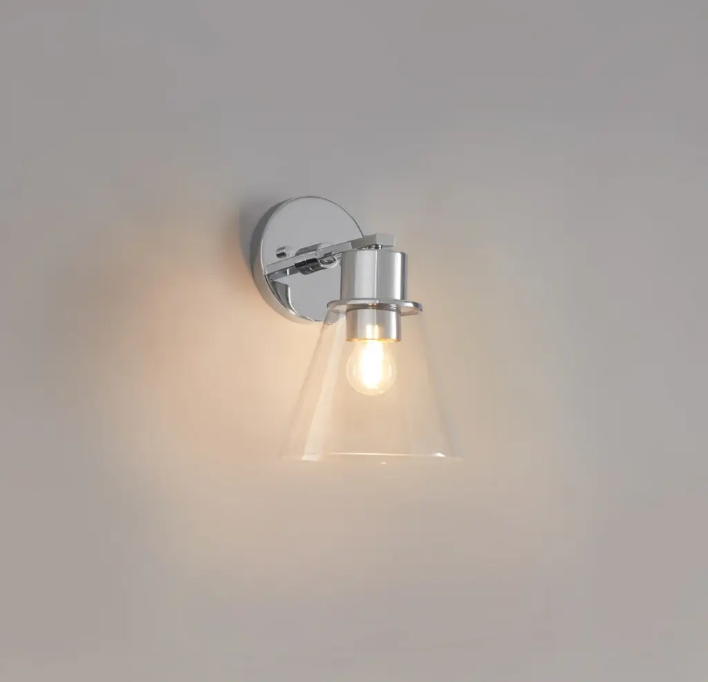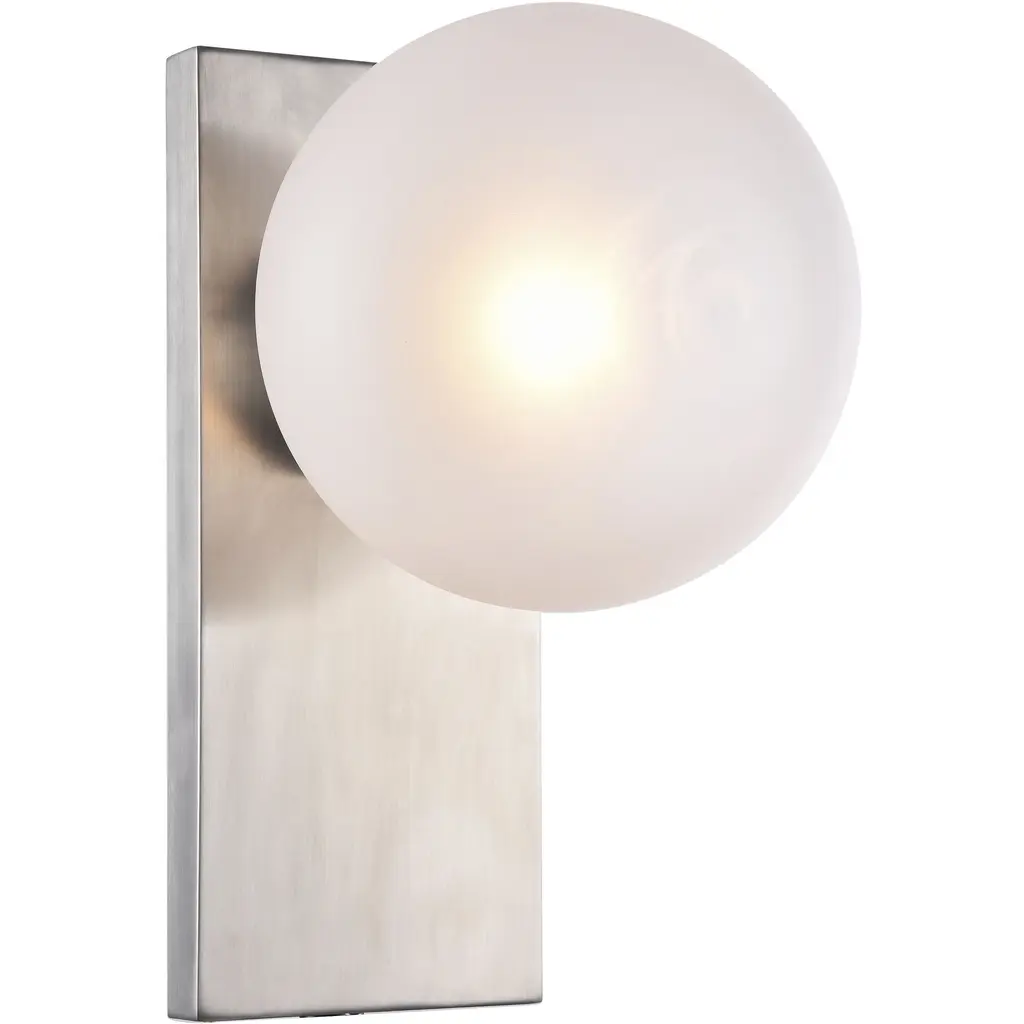 Stainless steel wall lightFor indoor useWattage: 60 WBulb not includedNumber of bulbs: 1Shade included: YesColor: ChromeMaterials: Stainless steel, glassDimensions: W 7.08" x D 7.08" x H 11.8"