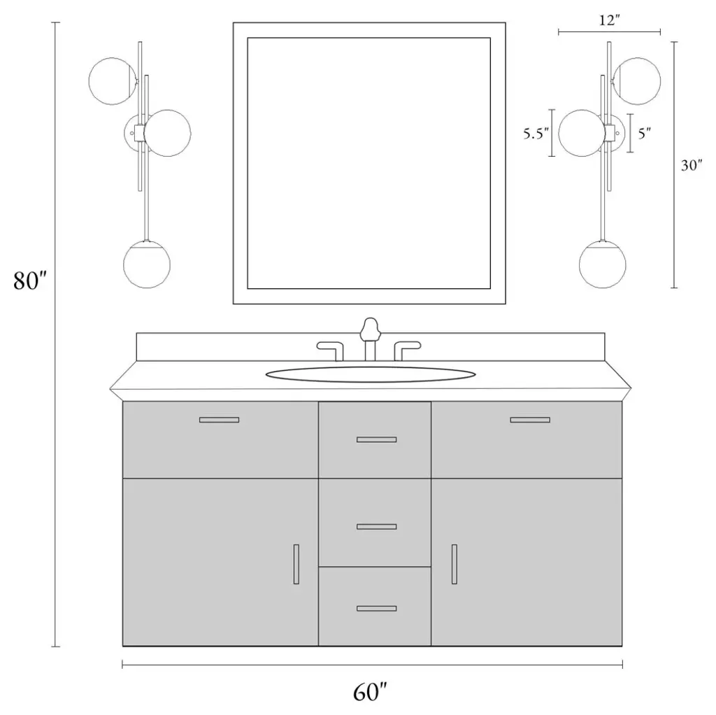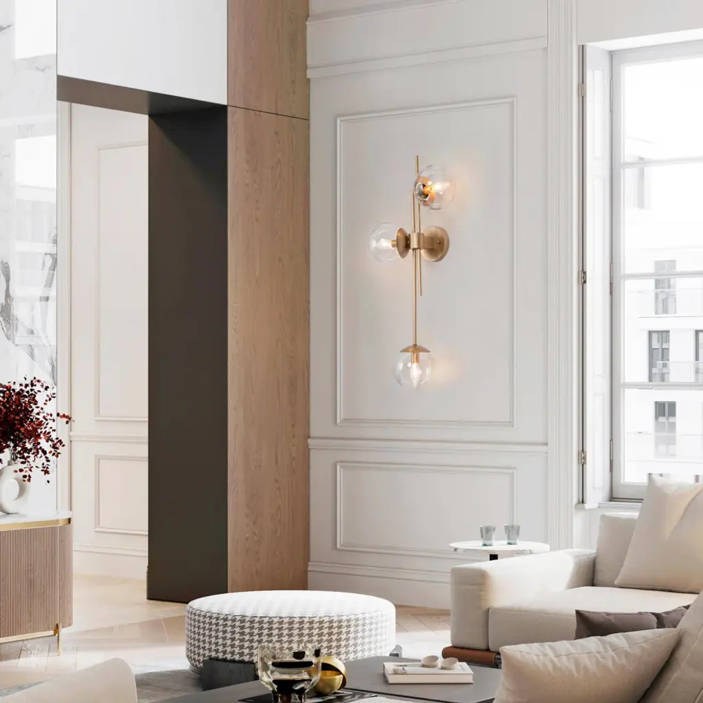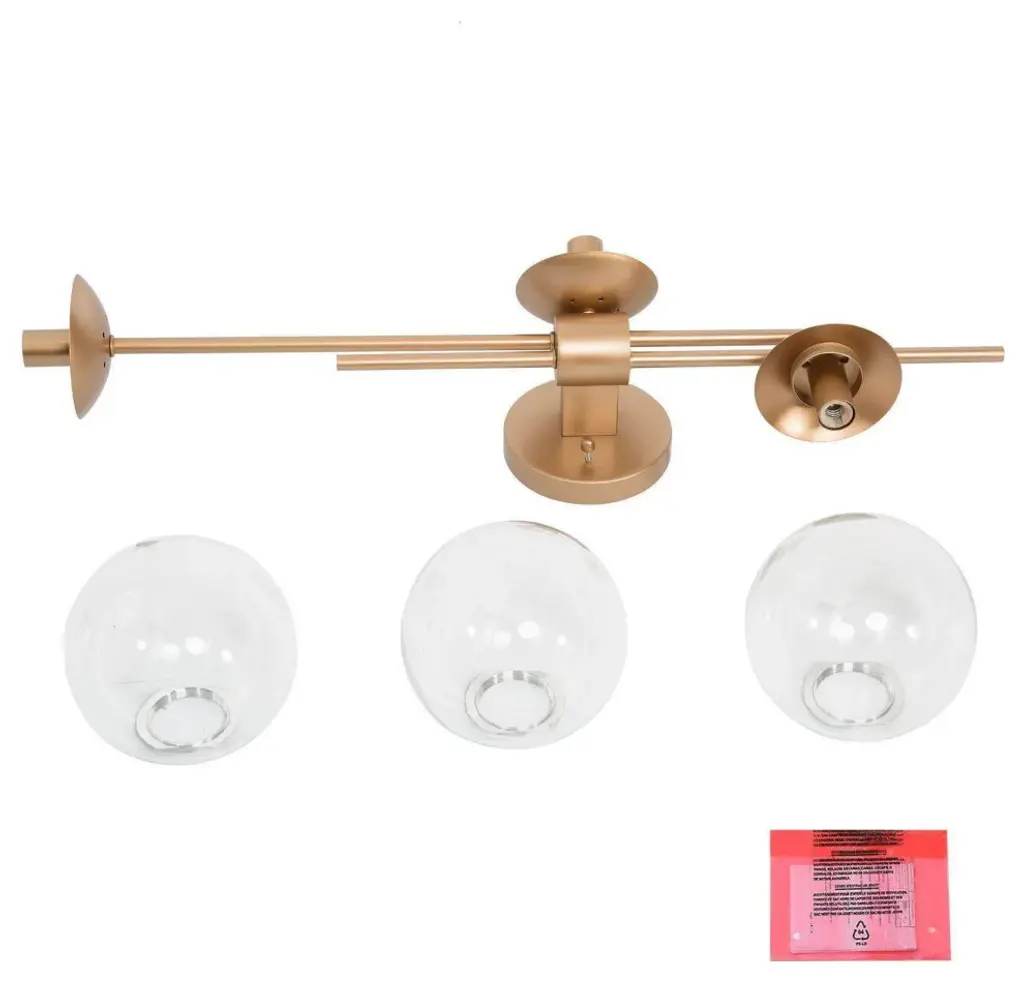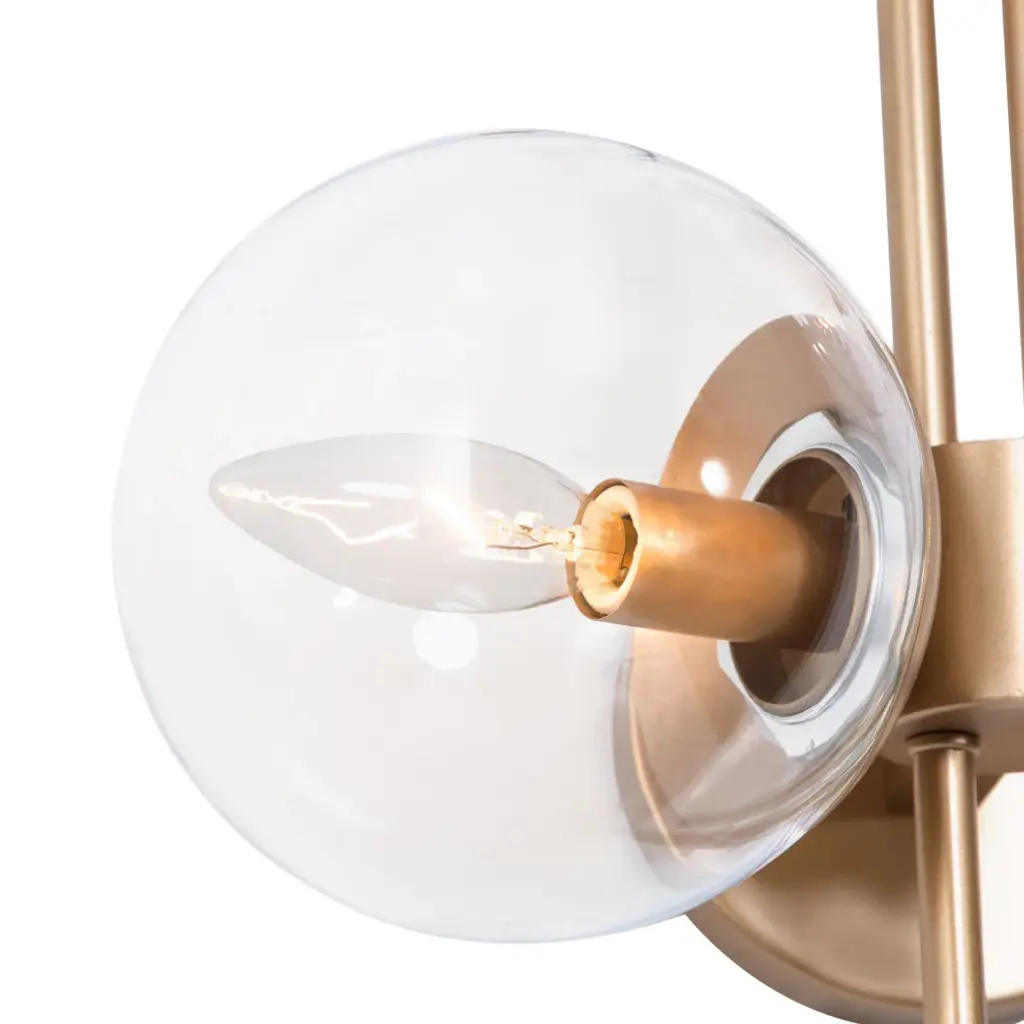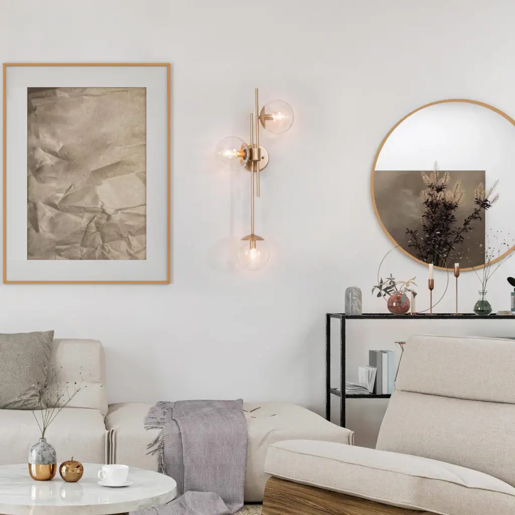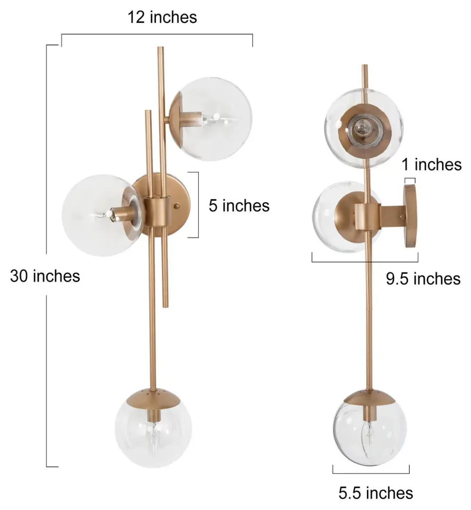 For those who seek simplicity with elegance, this 3-light wall sconce is the perfect blend of modern charm and understated luxury. Ideal for spaces like your bedroom, hallway, or living room, it elevates any area with its chic matte gold finish and glass globes that soften the light, creating a warm, inviting ambiance. It''s more than just a fixture"”it''s a design statement that speaks of style and sophistication.Key Features:• Sculptural Modern DesignA minimalist yet impactful design featuring clean lines and a matte gold finish. The round glass shades are designed to amplify the light while adding an artistic touch to your space.• Soft, Inviting IlluminationCompatible with A19 LED bulbs, this sconce creates a gentle, ambient glow that''s perfect for bedrooms, hallways, or living rooms. Choose the ideal lighting for your mood, whether you need soft lighting for relaxation or a brighter vibe for everyday use.• Durable, Quality MaterialsCrafted with precision from high-quality metal and clear glass, this sconce ensures long-lasting durability and timeless beauty that will elevate your home décor for years to come.• Versatile and Easy to InstallWith its sleek, wall-mounted design, this sconce is ideal for various ceiling types and easy to install with all mounting accessories included. Its clean design seamlessly blends into both modern and contemporary interiors.• Safe and PracticalWith UL safety certification and damp location suitability, this light fixture is perfect for various indoor spaces, from foyers to bathrooms to living rooms.Dimensions & Structure---Product Dimensions: 12"W x 9.5"D x 30"HCanopy Dimensions: 5"Dia. x 1"HShade Dimensions: 5.5"Dia. x 5.5"HProduct Weight: 3 lbsMount Type: Wall MountPower Source: HardwiredLighting Specs---Bulb Type: A19 LEDBulb Base: E-12Number of Bulbs: 3Maximum Wattage: 40WVoltage: 120VBulb Included: NoDimmable: Yes (when used with dimmable bulbs and a compatible dimmer switch)Additional Information---Materials: Metal, GlassFinish: Matte GoldShade Color: ClearShade Shape: GlobeSafety Listing: UL Safety ListingAssembly Required: YesMounting Hardware: IncludedProfessional Installation: RecommendedLocation: Dry/Damp Rated (indoor use only)