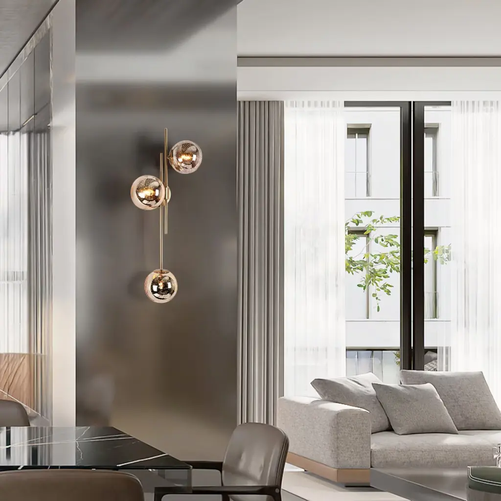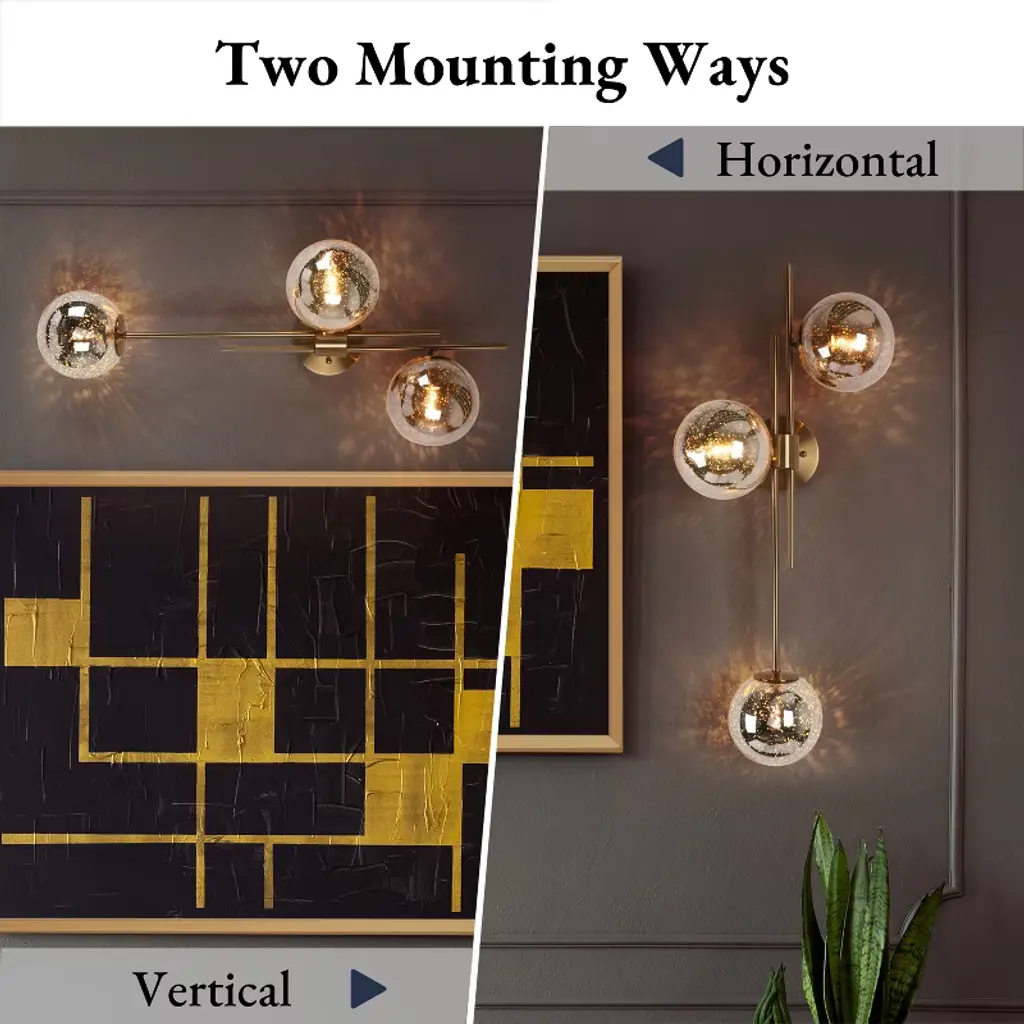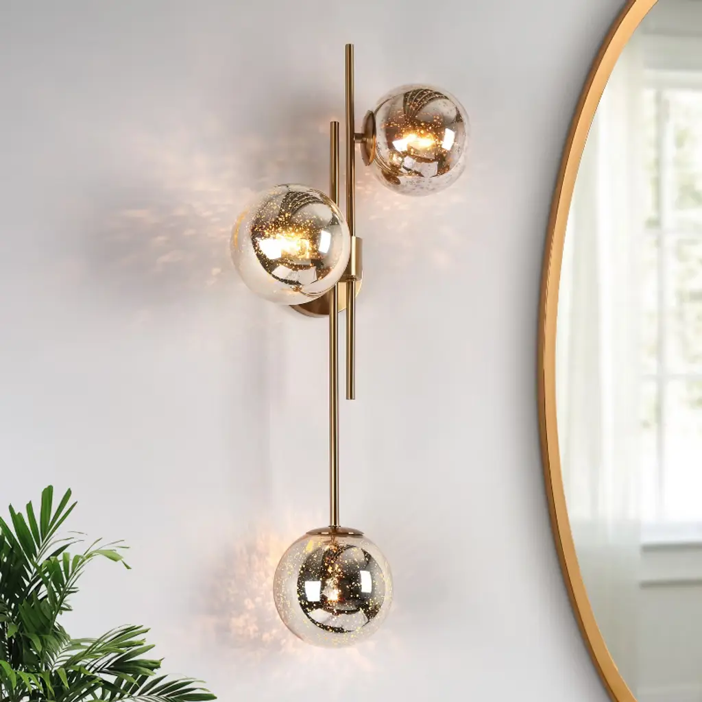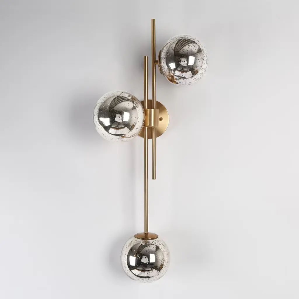 Revamp your bedside lighting with our modern and elegant wall sconce, designed to make a striking statement. Featuring high-end mercury glass globes suspended at varying lengths from a plated brass plate, this fixture adds a touch of sophistication to any space. Pair these sconces with a dark wall paint color to create a stunning contrast and make them truly stand out. Handcrafted by skilled artisans, this three-light modern gold wall sconce boasts a round backplate and straight arm finished in plated brass, complemented by premium mercury glass shades. Elevate your home decor with an understated luxury motif courtesy of this exquisite lighting fixture.
