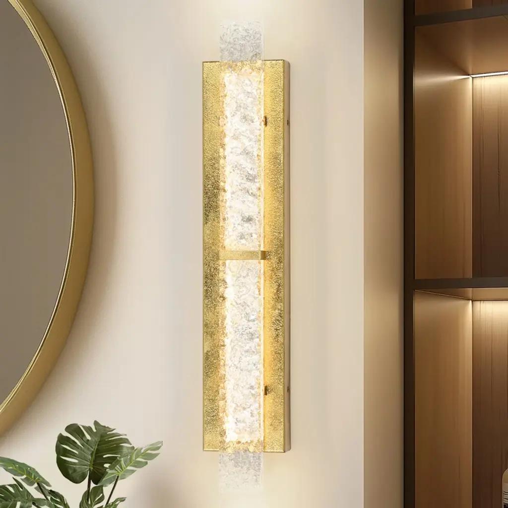 Brighten up your space with this sleek, modern gold single-light flush mount sconce. Featuring built-in LED lighting, it brings a touch of sophistication to any room, including dining areas, kitchens, and bedrooms. Ideal for contemporary settings, this fixture showcases a polished gold finish paired with a crackled glass cylinder shade, offering a blend of elegance and timeless charm. Its premium construction ensures a refined, luminous appeal.