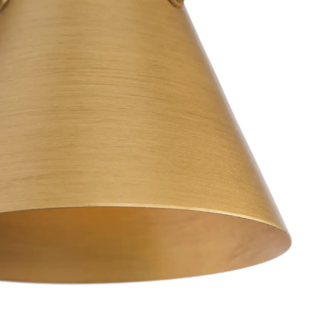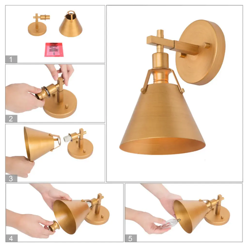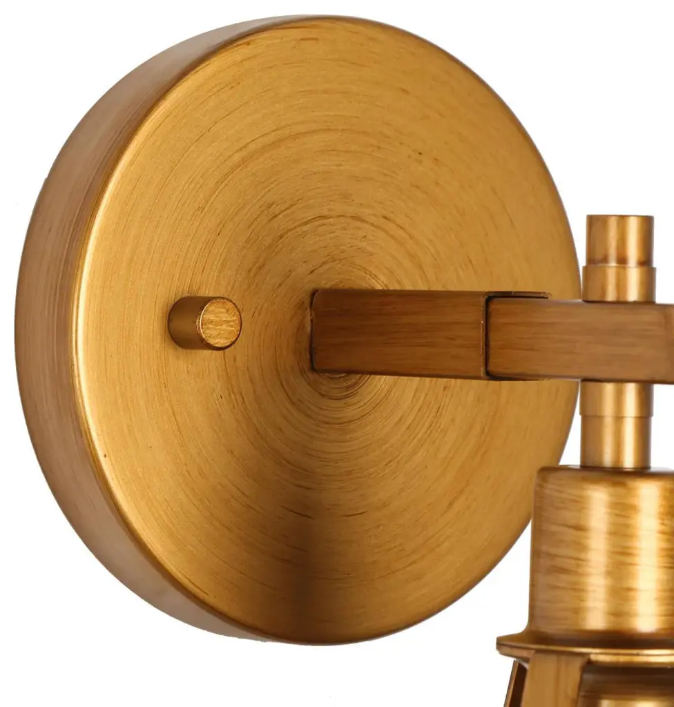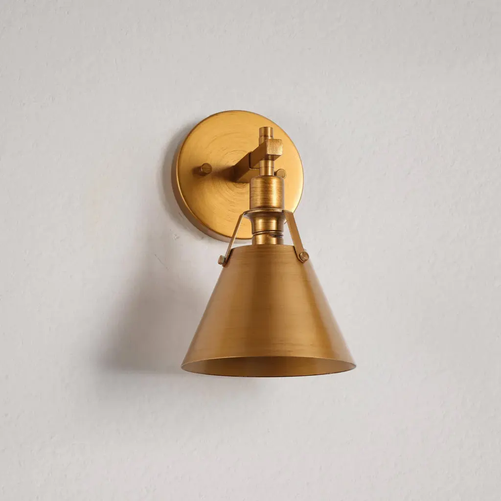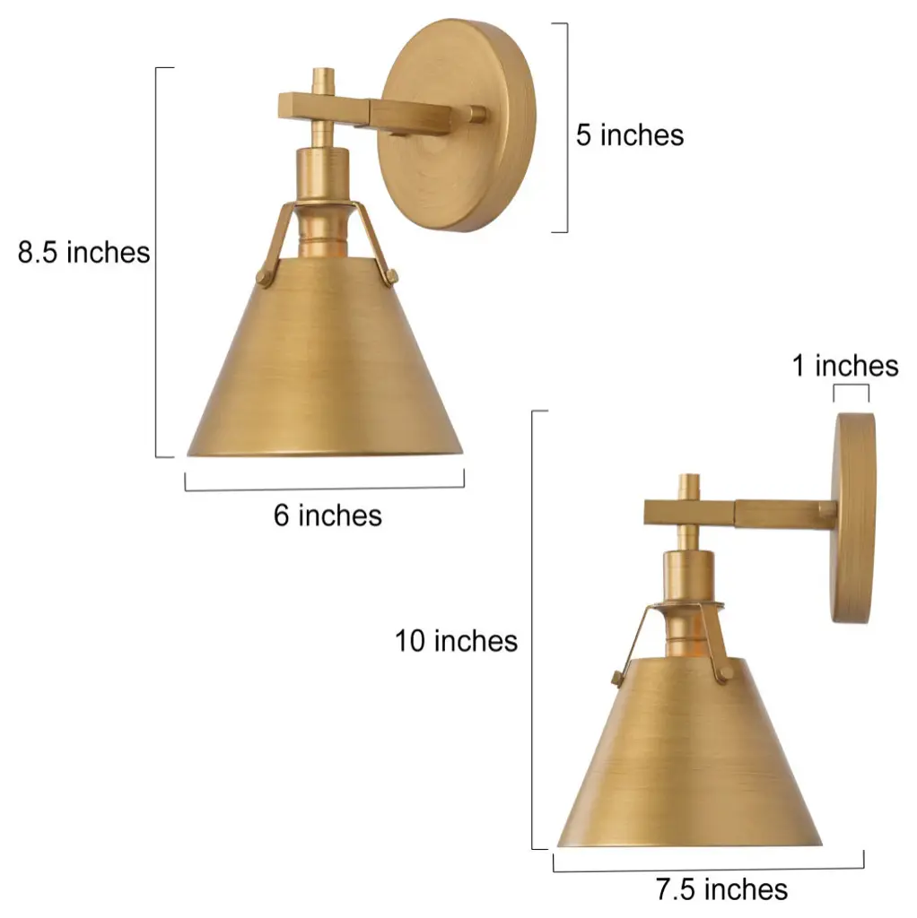 A Contemporary-inspired one-light wall sconce fixture with charming rustic character. This wall lamp adds character to any living room, dining room, kitchen and foyer. A curved, pipe-like bar extends out to hold a vintage metal light to complete the well-crafted design ideal for any bath and vanity setting in rustic, farmhouse, or urban industrial interiors. FeaturesModel: JZEAJ2HZ33911V7Material: MetalColor: GoldStyle: ModernFinish: Brushed Antique GoldProduct Dimension: 6"W x 10"H x 7.5"EProduct Weight: 1.1 lbs.Canopy Dimension: 5"D x 1"H Shade Material: MetalShade Color: Brushed Antique GoldShade Shape: BellShade Dimension: 6.5"W x 8.5"H x 6.5"ECompatible ceiling types: flat, sloped, slanted and vaulted ceilings Height/Vertically Adjustable: NoAdjustable Height: NoLocation: DampDimmable: Yes, when used with dimmer switch and dimmable bulbsKey FeaturesIntegrated LED: NoBulb Type: Type ABulb Base: E12 Maximum Wattage: 40WNumber of Bulb: 1Bulb Included: Not IncludedVoltage: 120VMount Type: Wall MountsAssembly Required: YesMounting Accessory Included: YesPower Source: HardwiredProfessional installation recommended