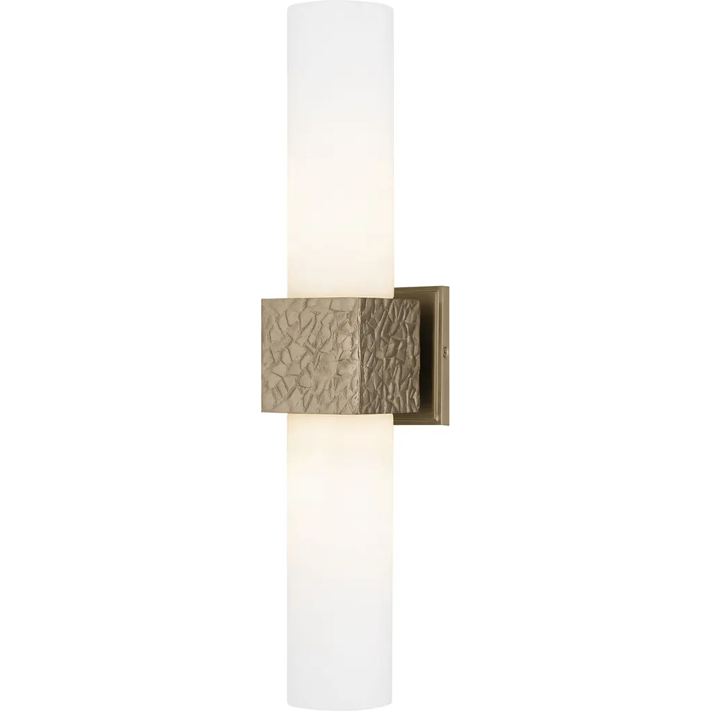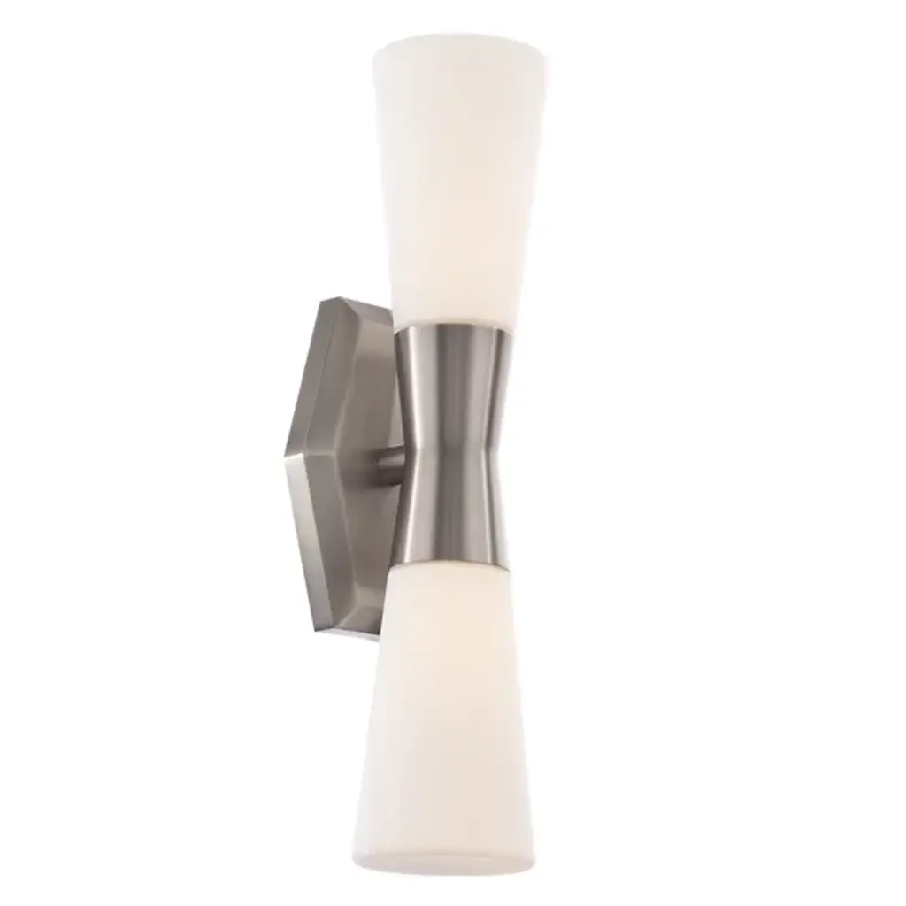 A swanky mid-century modern design delivering looks and light. Dress up your home with the fine styling of the Locke LED Wall Sconce from dweLED. Let a soft ambient glow stream across your hallways in a horizontal format or fan from the floor to the ceiling in a vertical one through its versatile backplate. The metal backplate dazzles on its own with a gem-like design cut with precise beveled edges. Capping off a sharp metal lamp holder, twin tapered shades blown in opal glass filter LED light to a perfect level that caresses the eyes.