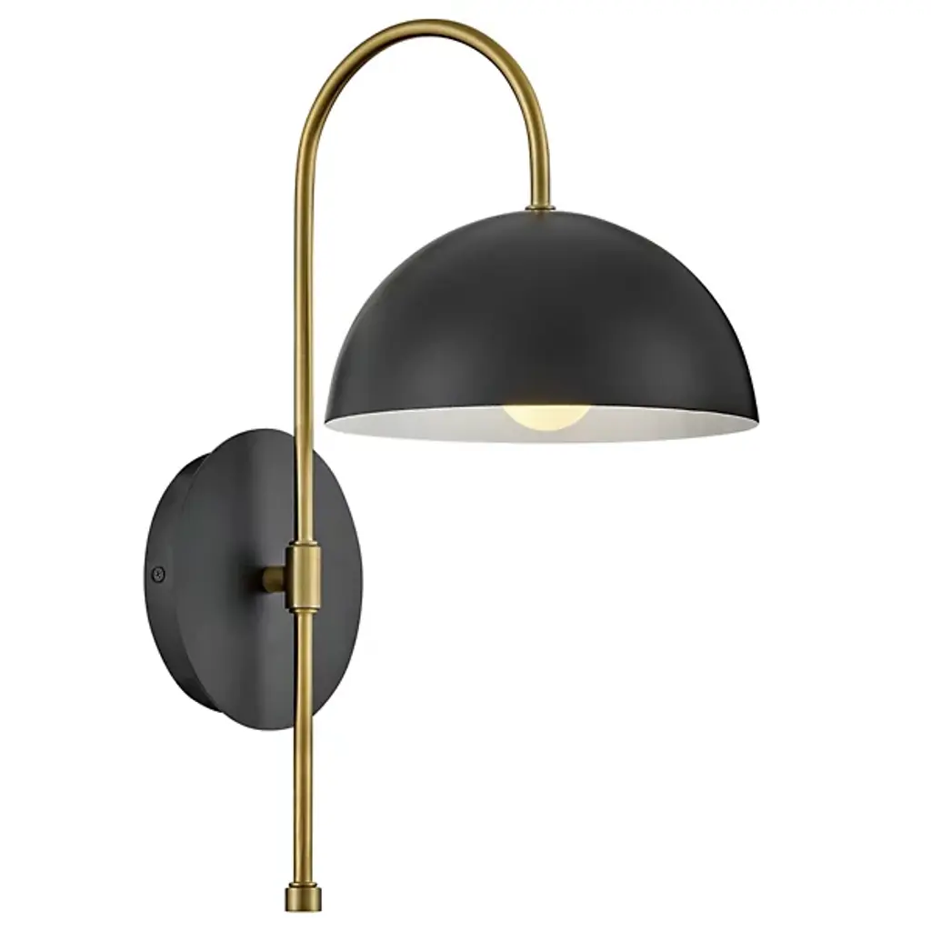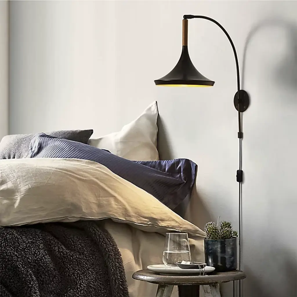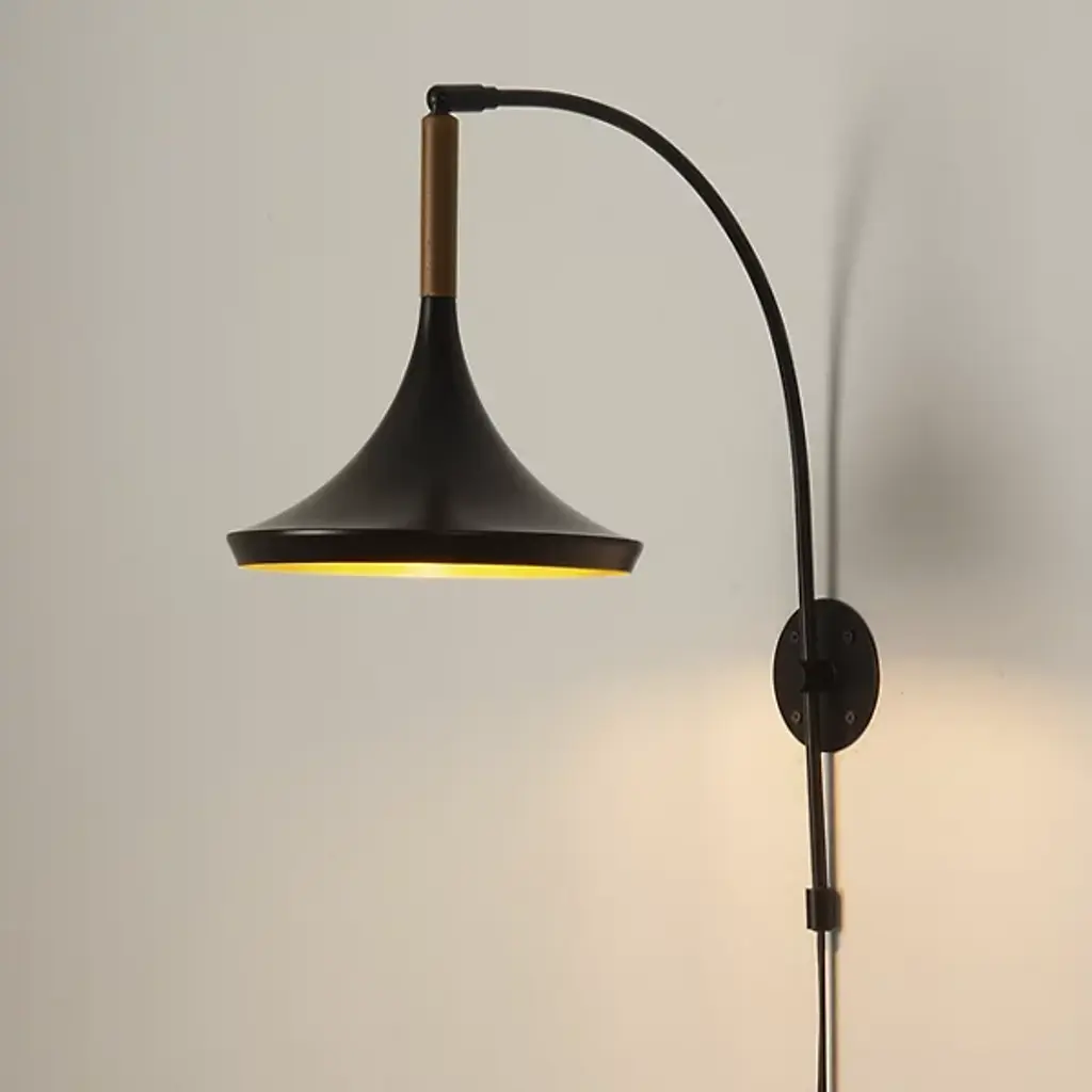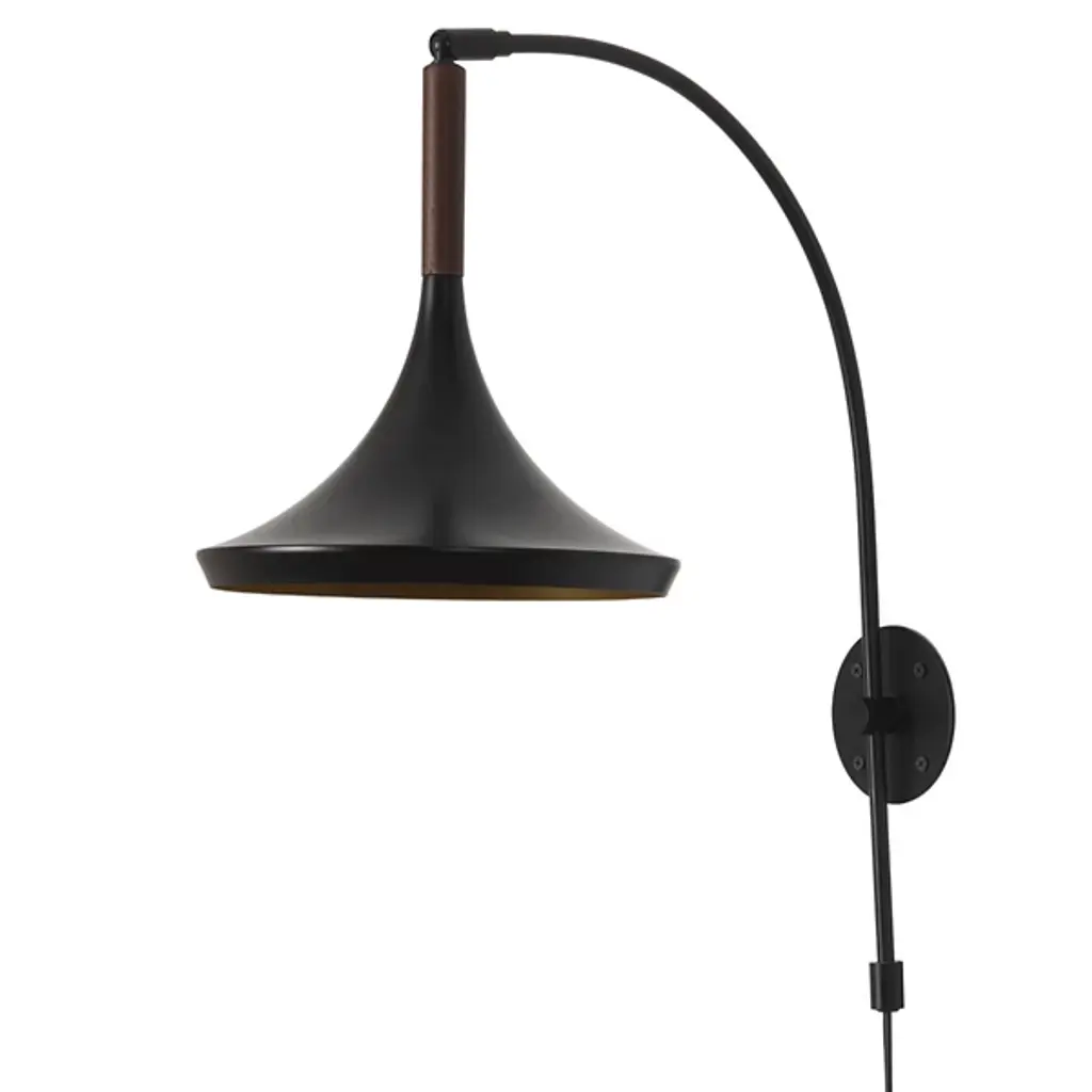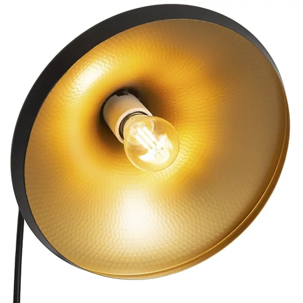 The Lodi Plug In Wall Sconce from Nova of California enhances your space with charming vintage flair and stately sophistication. This transitional sconce features a matte black finish that complements its unique hammered metal shade and walnut accent, counterpointed by a rich, hand-applied gold leaf interior. More than just a light source, the sconce's artistry and rich construction make it a timeless statement piece designed to endure. The contrasting blend of materials and finishes makes it an elegant addition to any room, combining aesthetic appeal with functional design for lasting beauty.