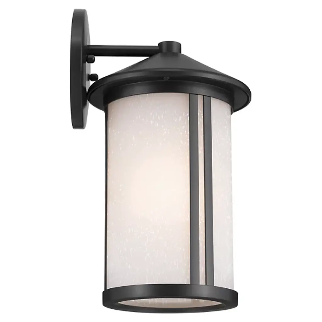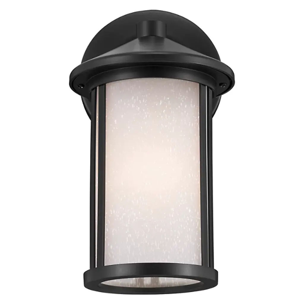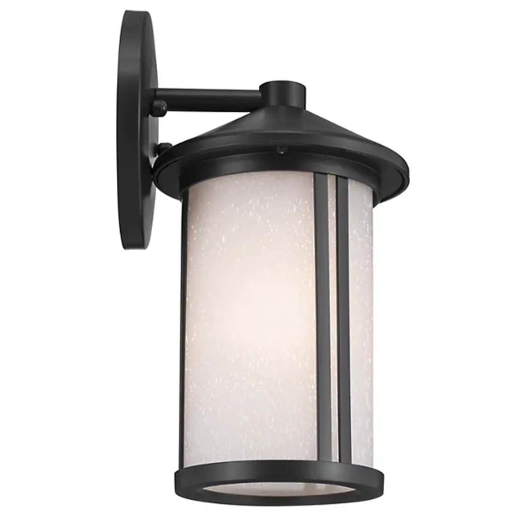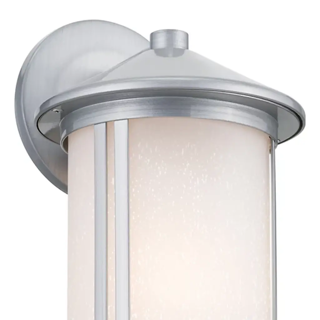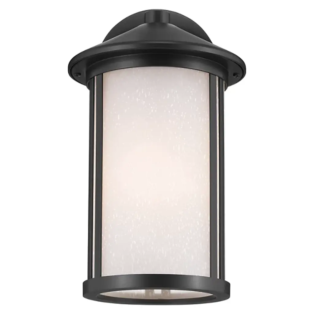 The Lombard Outdoor Wall Sconce from Kichler brings industrial heritage to exterior spaces through its purposeful design. The aluminum framework provides a solid foundation, while satin-etched seeded glass creates an atmospheric glow that enhances nighttime visibility. The glass treatment produces gentle light gradients that complement the fixture's structured form. This sconce’s circular backplate and scaled proportions work well on exterior walls, providing inviting illumination. The seeded glass pattern adds dimension to the light output without compromising clarity.