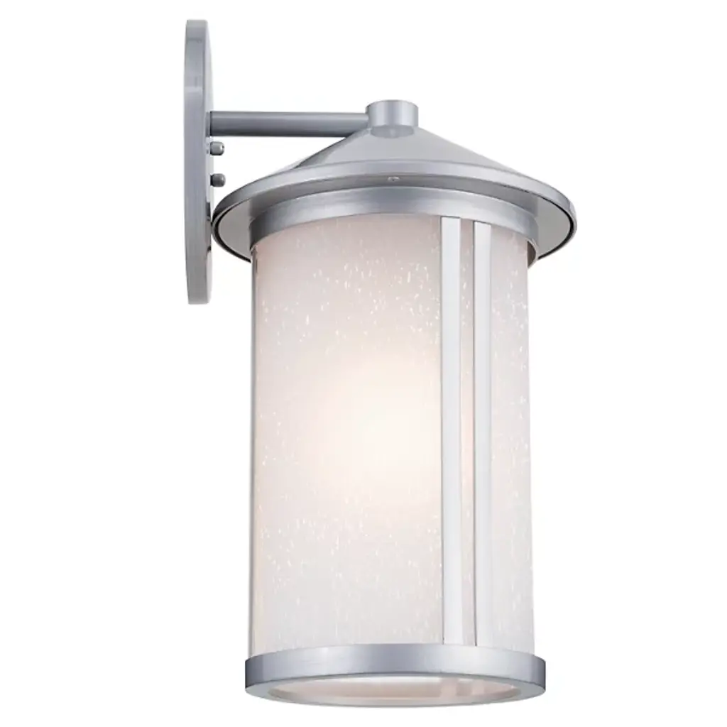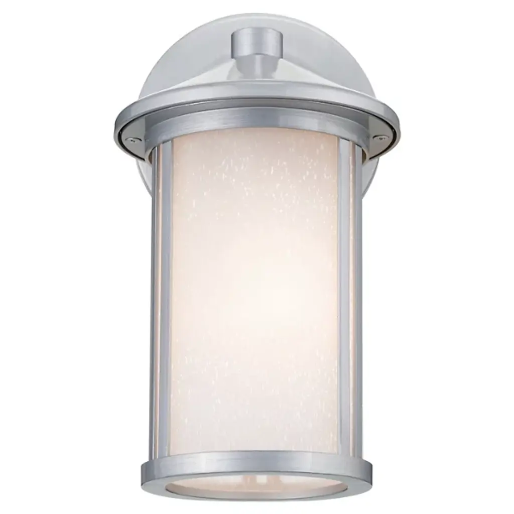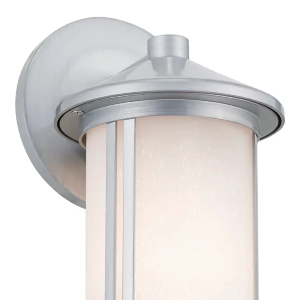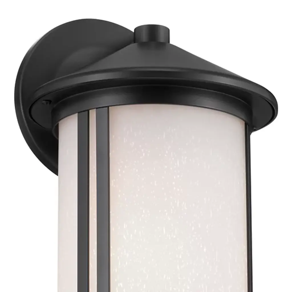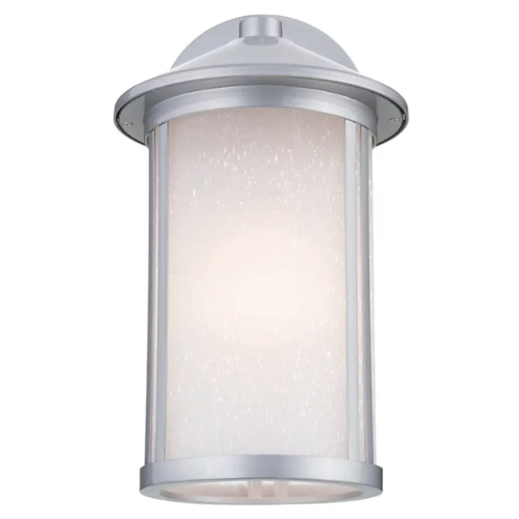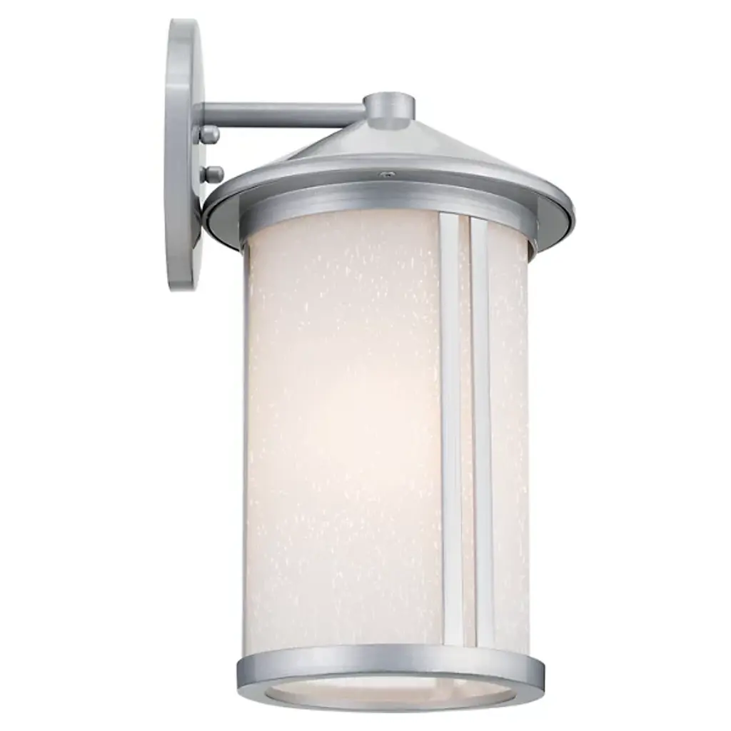 The Lombard Outdoor Wall Sconce from Kichler brings industrial heritage to exterior spaces through its purposeful design. The aluminum framework provides a solid foundation, while satin-etched seeded glass creates an atmospheric glow that enhances nighttime visibility. The glass treatment produces gentle light gradients that complement the fixture's structured form. This sconce’s circular backplate and scaled proportions work well on exterior walls, providing inviting illumination. The seeded glass pattern adds dimension to the light output without compromising clarity.