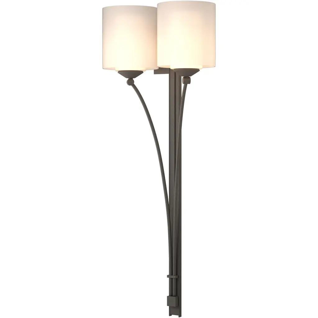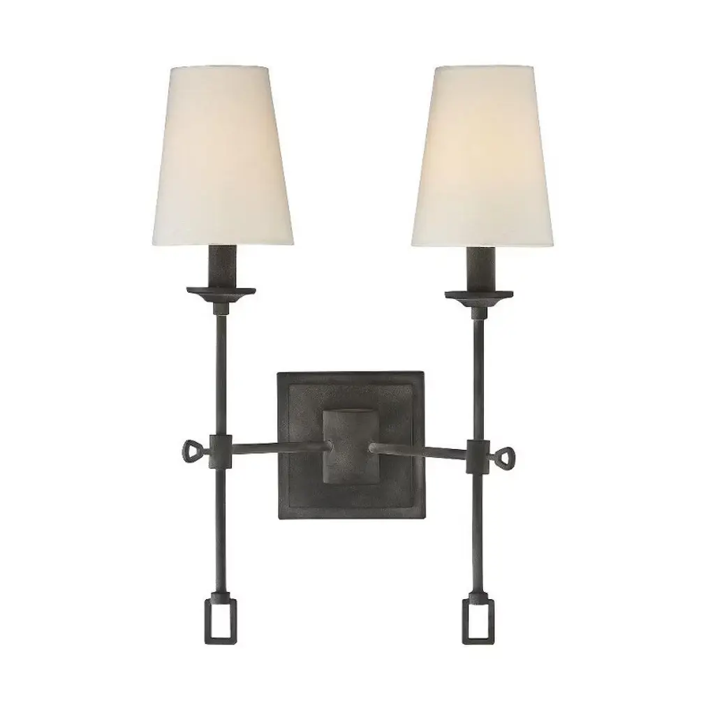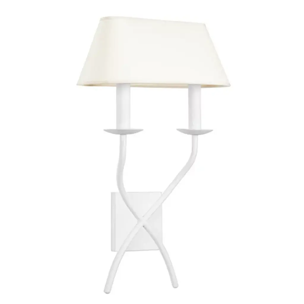 The Lomita 2 Light Wall Sconce from Troy Lighting features a framework of intersecting metal bands in a striking X-shaped silhouette. Suspended at the center is a triangular prism shade covered in white paper for soft, ambient light diffusion. Outfitted for two lamps, this sconce casts light in opposing directions, well-suited for halls and foyer spaces. With its artful open frame and geometric shade, Lomita makes a contemporary statement wherever it's hung.
