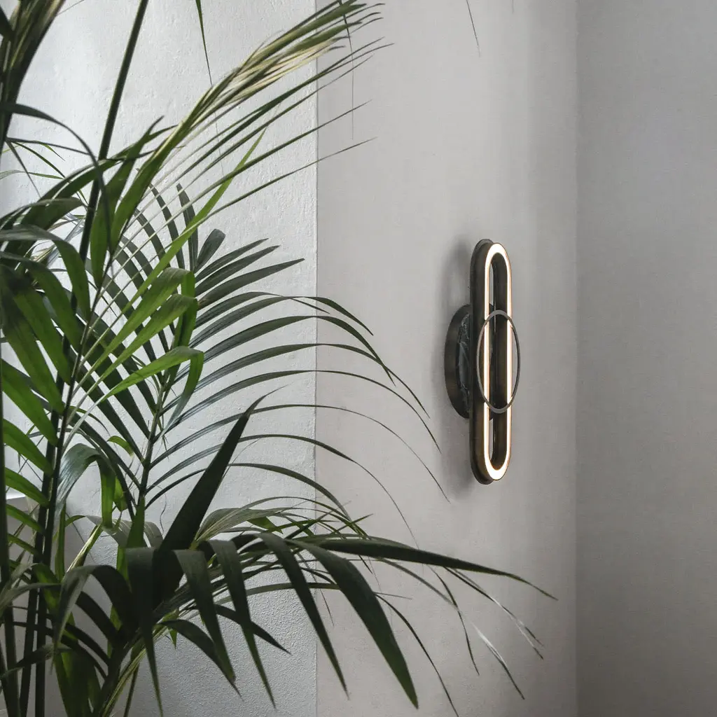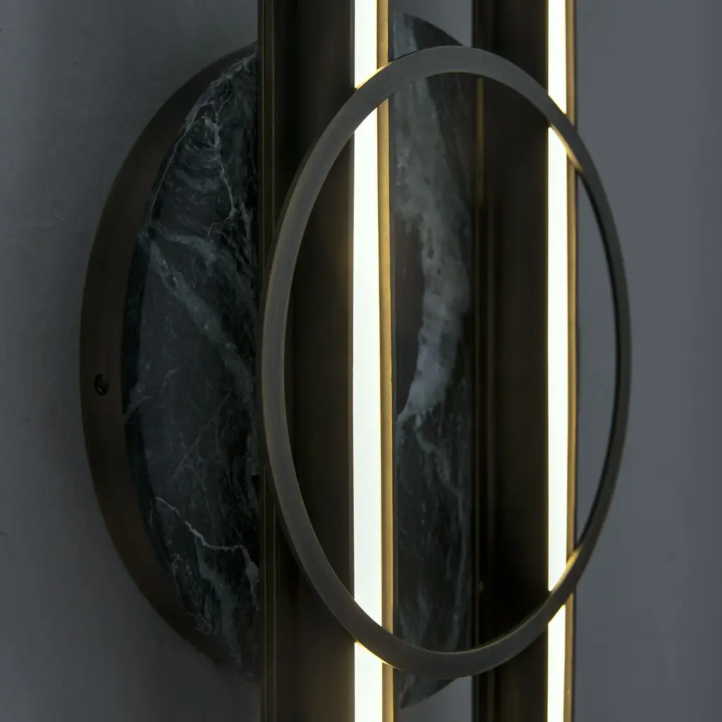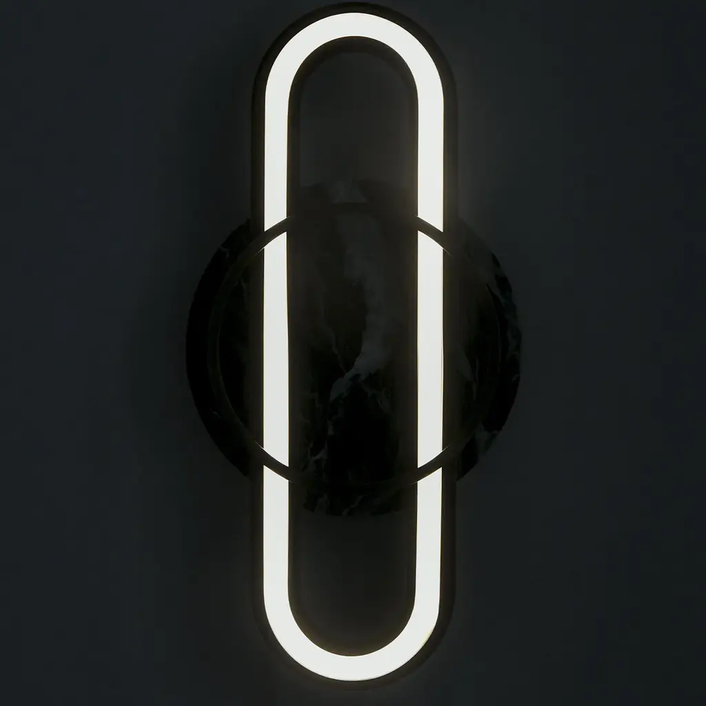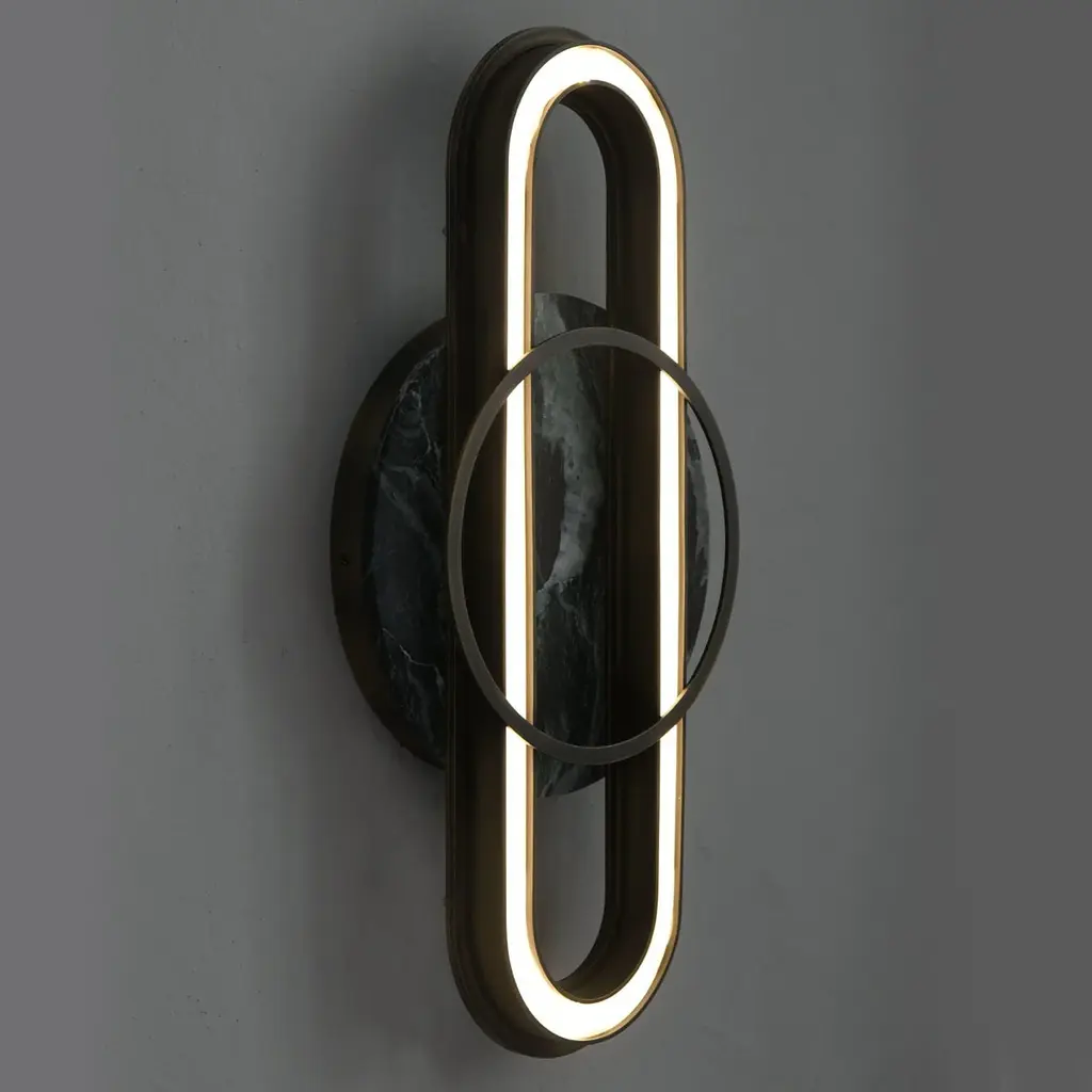 Loop is a diffused-light wall sconce with a shape that emphasizes a continuous circular movement, apt to give dynamism. The structure is composed of a hand-curved galvanized brass frame combined with a marble dial. It is also available in different sizes with the possibility of customizing stone types and light intensity.