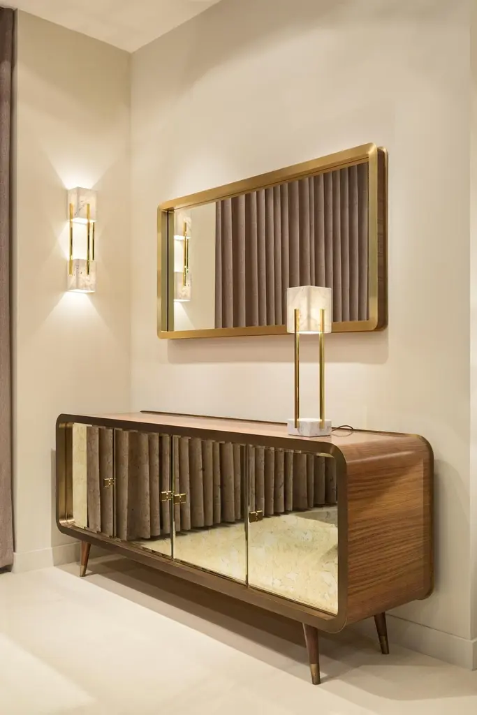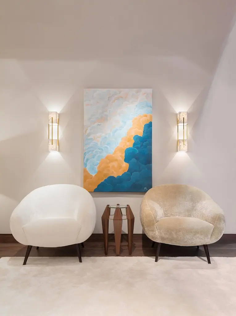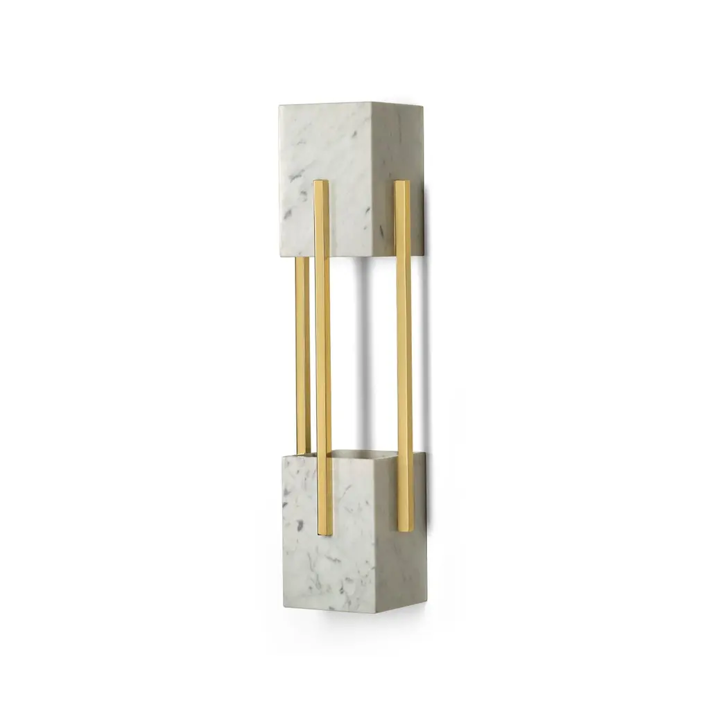 The Looshaus wall lamp is a contemporary design that interprets the modernist austerity of the Looshaus building by architect Adolf Loos.The Looshaus building in Vienna marked a turning point in architecture by its rejection of historicism and the evolution towards Modernism. The radical aesthetic implemented on the ground floor columns triggered a reflection about the purism of materials and forms.Being made with two carved blocks of marble, Looshaus is a contemporary luxury lighting piece, designed to be part of a special residential project or luxury hotel. The light exalts the beauty of the marble’s natural rays while directly illuminating the open gallery created by the vertical brass columns and projecting an incredibly beautiful geometric effect.Product detailsLampshade: Carrara marble.Metal: handcrafted structure in polished brass finished with gloss varnish.Product optionsLampshade: other marbles under request.Metal: polished, brushed, oxidized brushed or aged brushed brass/copper/steel.Weight3.5Kg 7.8 lbs Electrical characteristicsMains: 3 wires connection - Live ; Neutral ; EarthFrequency: 50-60HzLamp: G9, 2x25W max.USAVoltage: 110-130VACEuropeVoltage: 220-240VACMade to order. Custom sizes and other finishes are available under request. Designed by Joana Santos Barbosa, 2016. Handmade in Portugal.