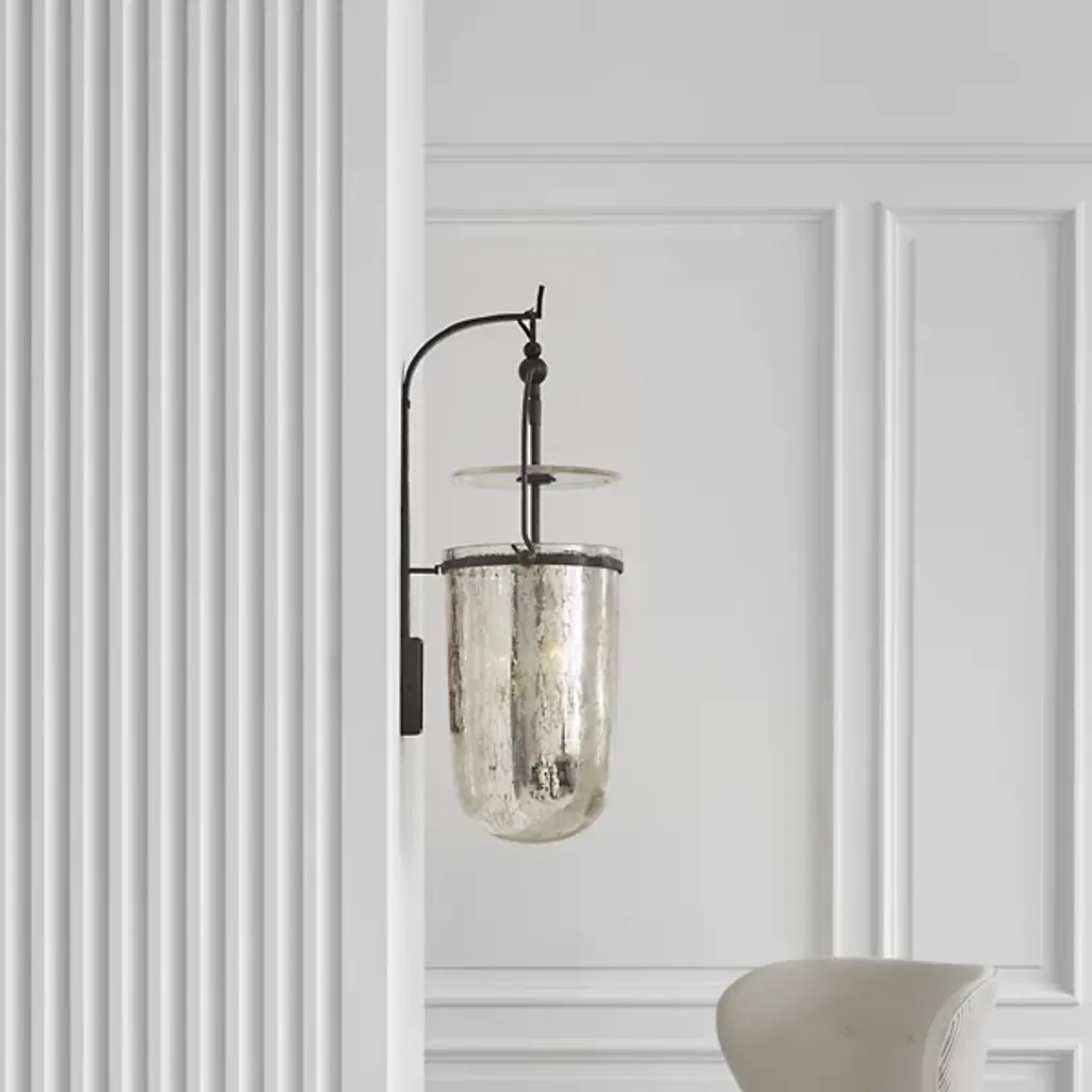 Sculptural, dramatic, organic. The Lorford Wall Sconce from Visual Comfort Signature, formerly known as Visual Comfort, makes a name for itself with a collection of intricate shapes, all connected by the attractive power of the curve. The sconce adds a surge of energy to the room or the hallway as a contemporary design. A low-profile backplate mounts the sconce while holding an arching arm. Fine metal brackets arch below, adding graphic contours to the texture-rich glass below. Topped with a similar skinny disc, the shade produces an elegant bullet silhouette and a bevy of artisanal details. These details reveal and conceal the light source, giving one a radiant yet relaxed glow