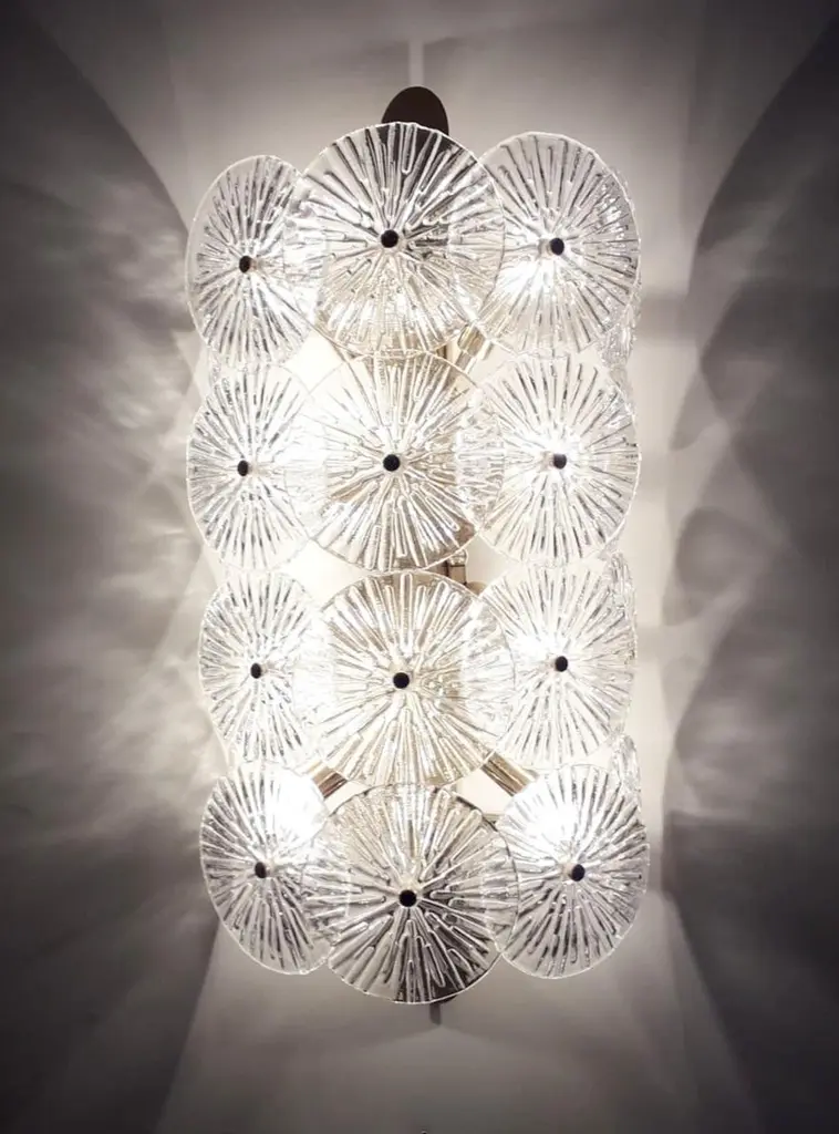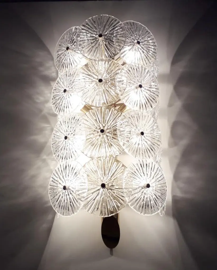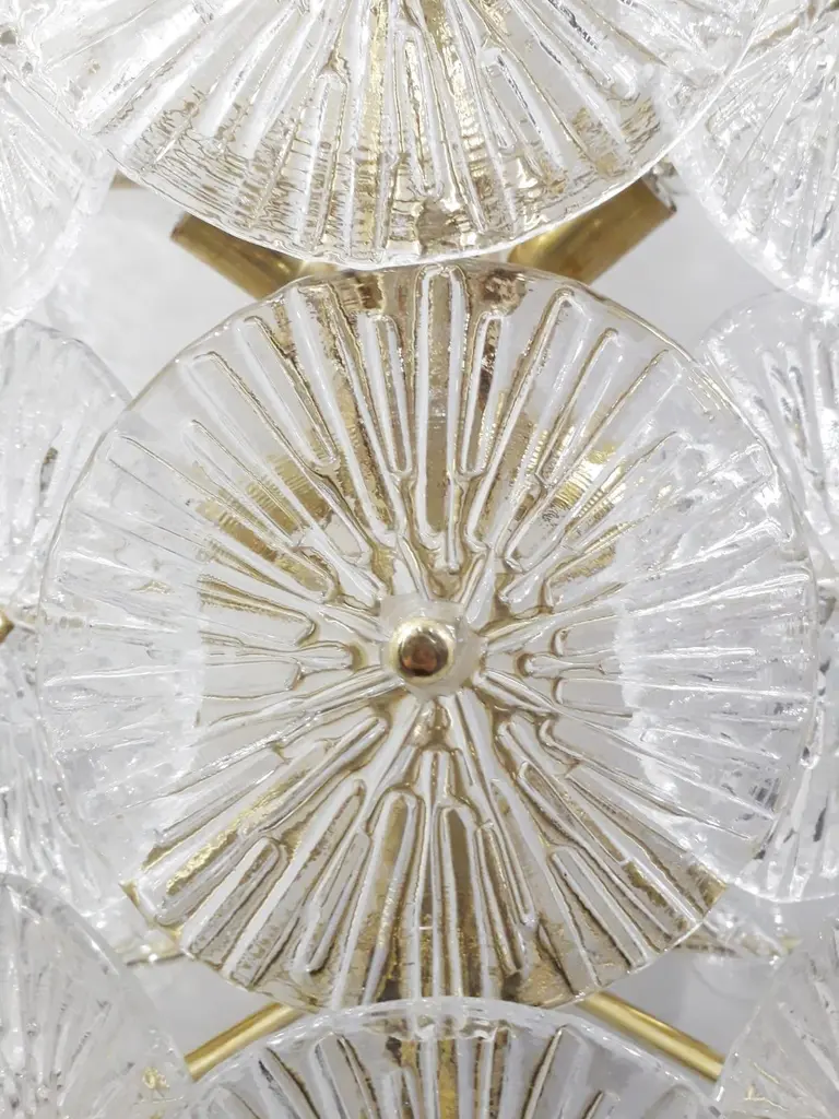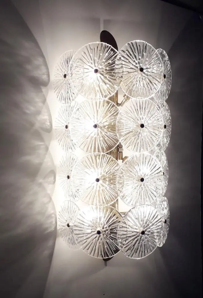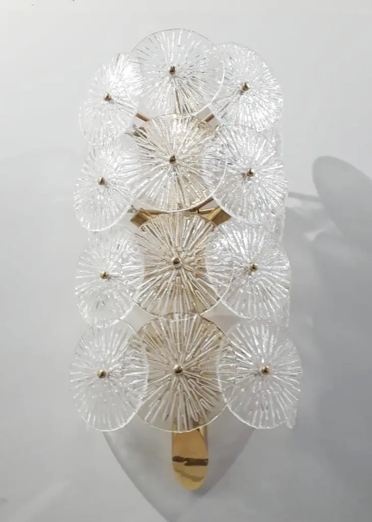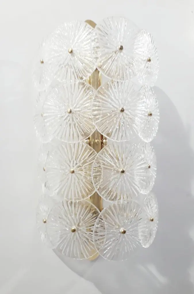 Oversized impressive Italian wall lights with clear textured Murano glass discs mounted on solid brass frames in polished lacquered finish, designed by Fabio Bergomi for Fabio Ltd, made in Italy8 lights / E12 or E14 type / max 40W eachMeasures: height 31.5 inches, width 13 inches, depth 8.5 inchesOrder only / this item ships from ItalyOrder reference #: FABIOTD W736