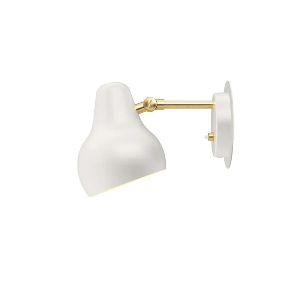 Louis Poulsen, wall lamp by Vilhelm LauritzenMeasures: Width 135 x height 190 x length 290(mm), 1.1 kgMaterial: Rear housing and shade: aluminum. Arm: brass. Cord length: 3.3 m. Switch: On the rear housing with two dimming settings. LED driver: Integrated in the rear housing. There is a timer function for automatic switch off that can be set to 4 hours or 8 hours. It is possible to set the lamp to turn on with a specific light level. Please note that the brass surface is left untreated. This means that the surface will change over time and develop a patina. The angle of the shade can be adjusted to optimize light distribution. The lamp is fitted with an integrated energy-saving LED light source.