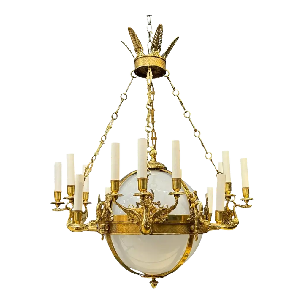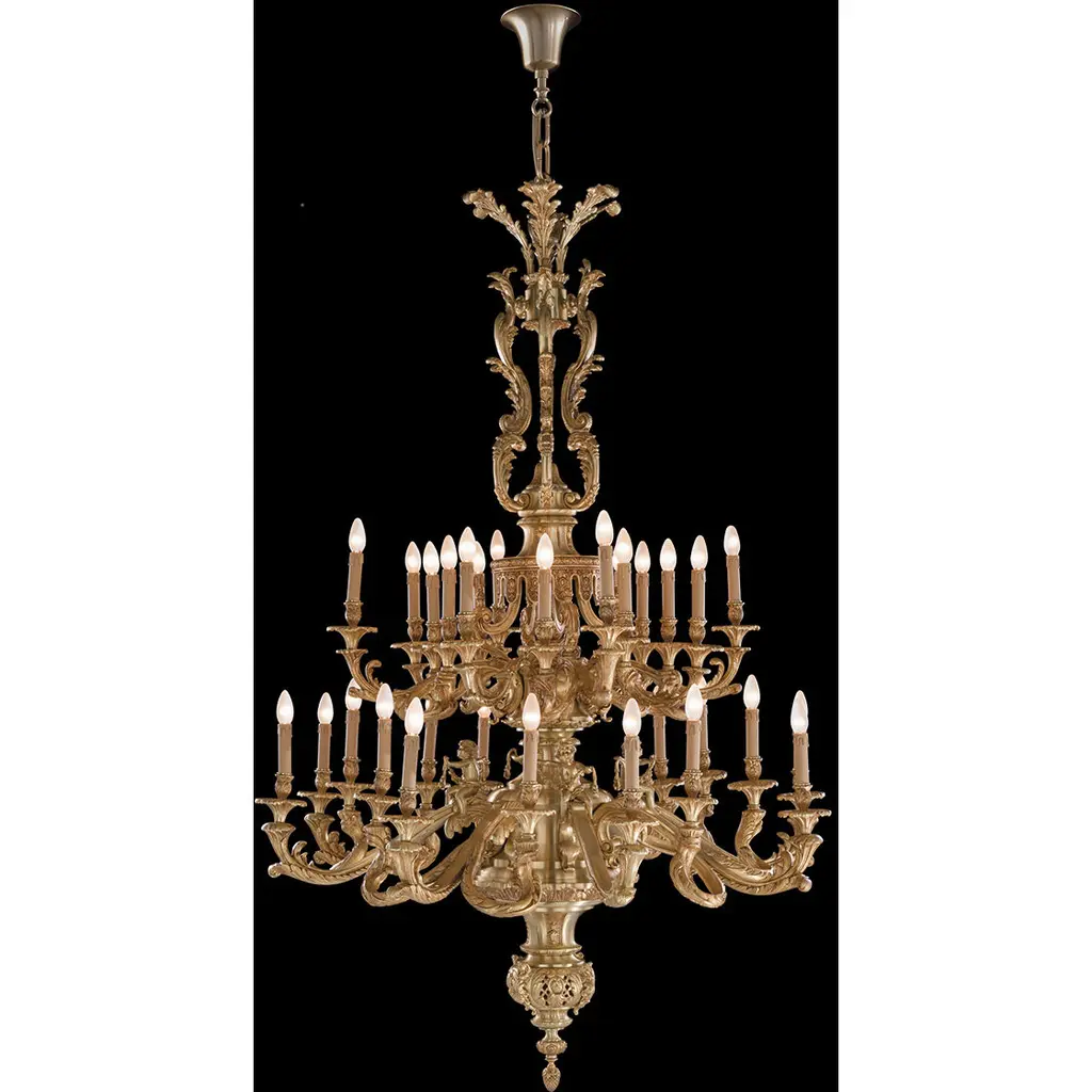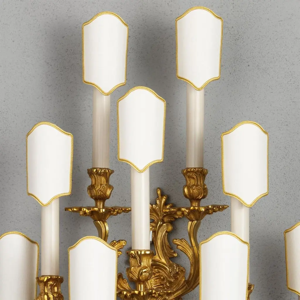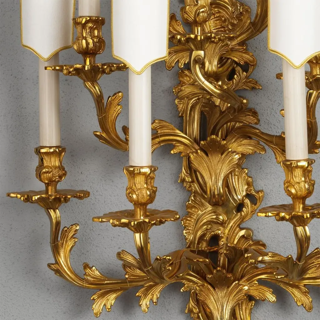 Louis XV style gilt bronze wall sconce by Gherardo Degli Albizzi is cast in the traditional manner with all the sumptuous movement of the Rococo period, having fourteen arms issuing from the plate and adorned with acanthus leaves and floral motifs. Sconce is finished with shades with gild embroidery edge.