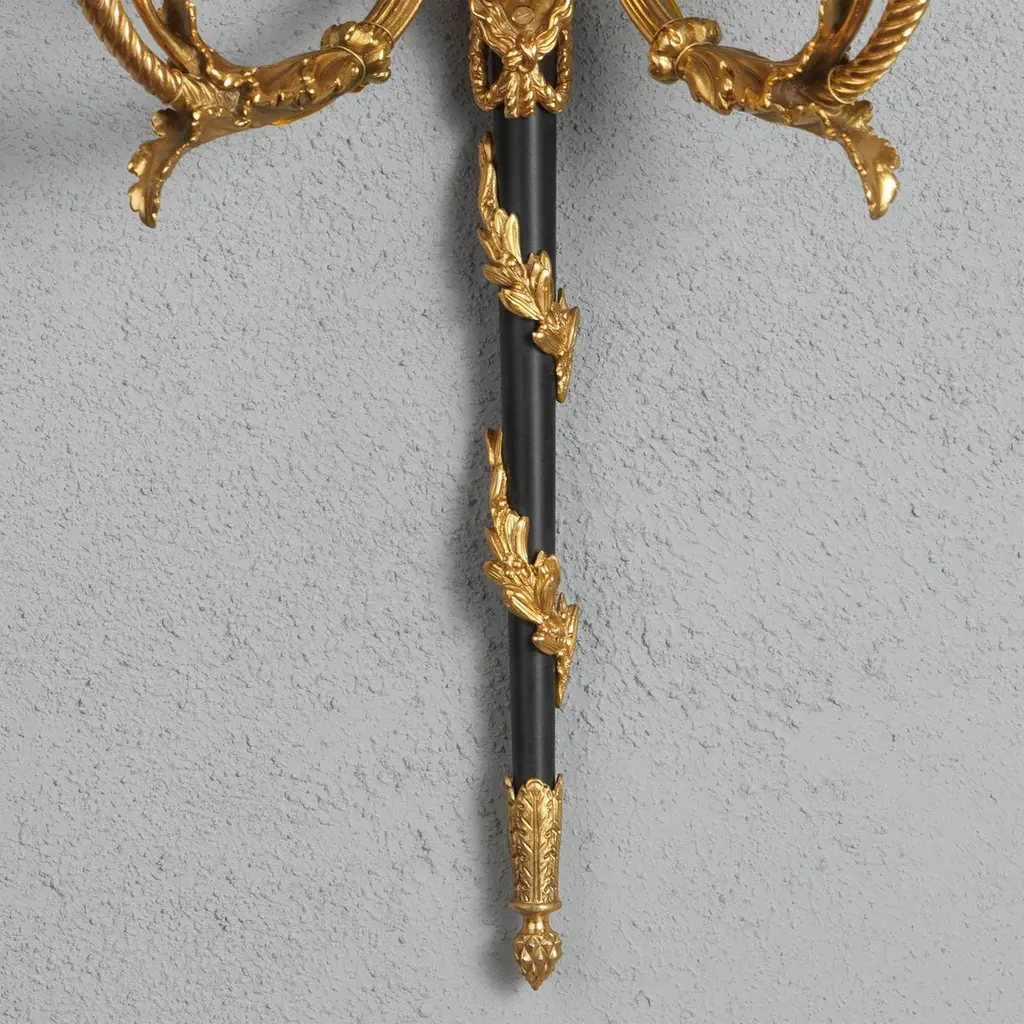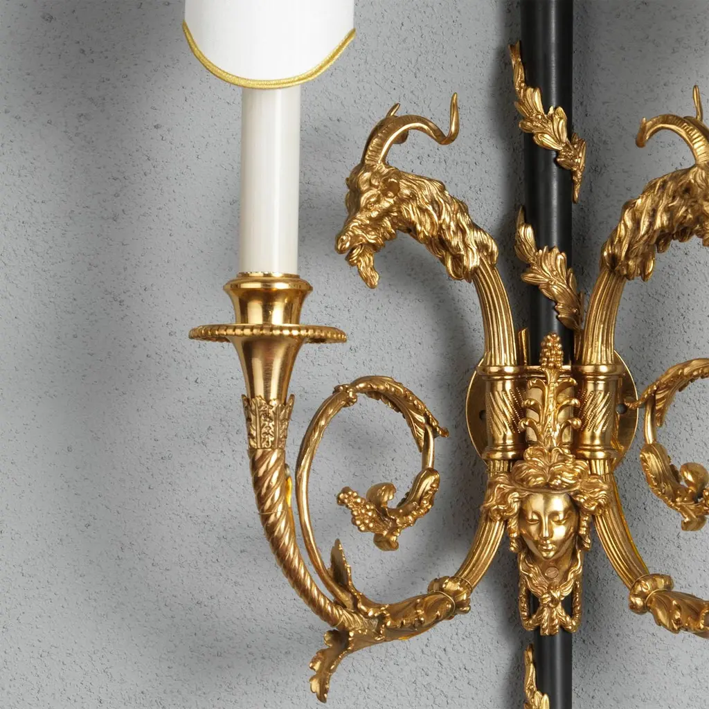 This Louis XVI Style Gilt and Burnished Bronze Sconce by Gherardo Degli Albizzi two-arm sconce is centred by burnished bronze rod decorated with a spiral vegetal motif and pine finial. The arms display impressive and richly chased detailed etched leaves, fruit and goat heads while in the center there is a decorative mask.
