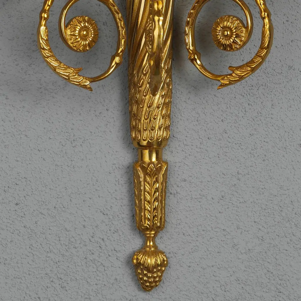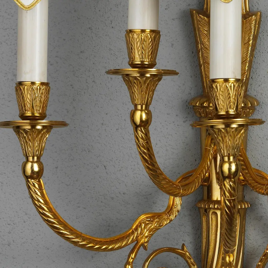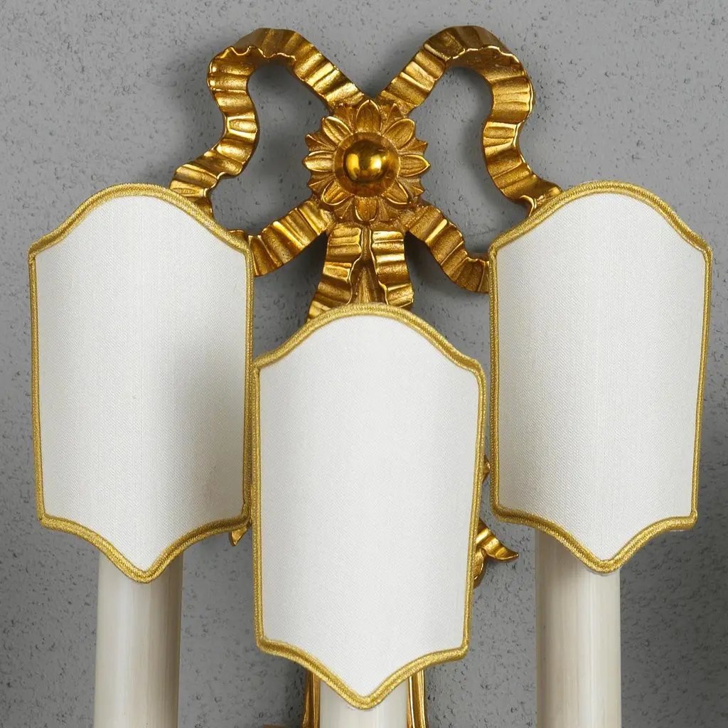 This elegant five-light Louis XVI style wall sconce by Gherardo Degli Albizzishows many high-quality hand chiselled details. At the top, there is a tassel, a typical element of Louis XVI period, and below there is quiver with arrows.In the middle section, five arms have got a vegetal decoration and a screw motif. Candleholders feature geometric decoration.The lower part of the main section resumes screw motif while the bottom of this sconce is ended with a pine finial.The sconce is provided with five shantung shades.