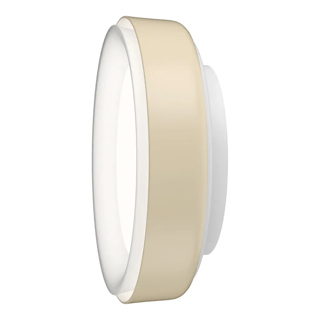 The circular luminaire emits a combination of softly diffused, glare-free, downwardly directed light and reflected indirect light from its curved upper rings. A large angled reflector encircles the diffuser and reduces the contrast around the edge. The top reflector is perfectly curved to distribute uplight at a broad angle. A colored outer shade surrounds the reflector and creates an interreflection of light, resulting in a graceful glow on the outside of the top and bottom reflectors. In total, it creates four rings of light surrounding the central diffuser.