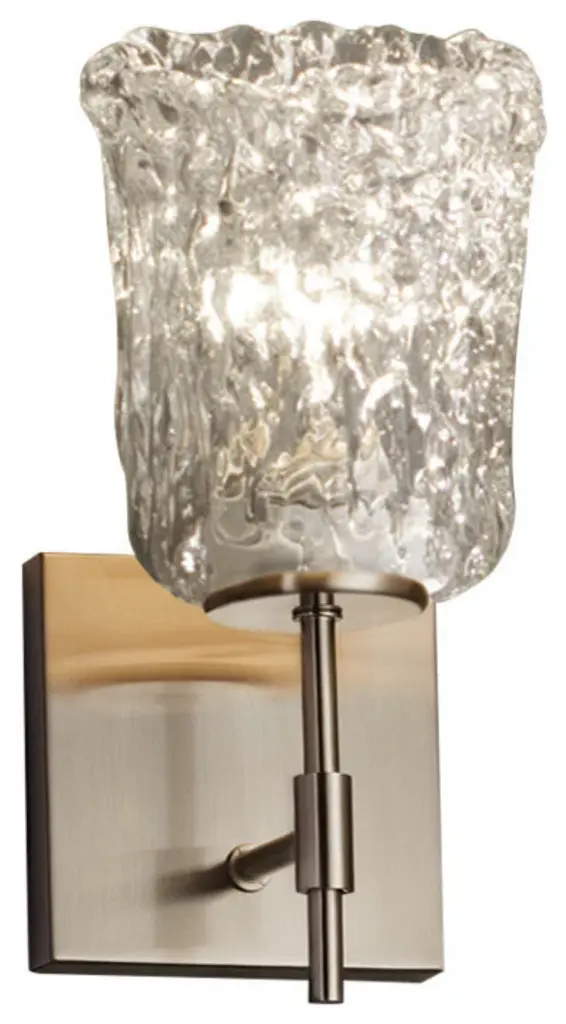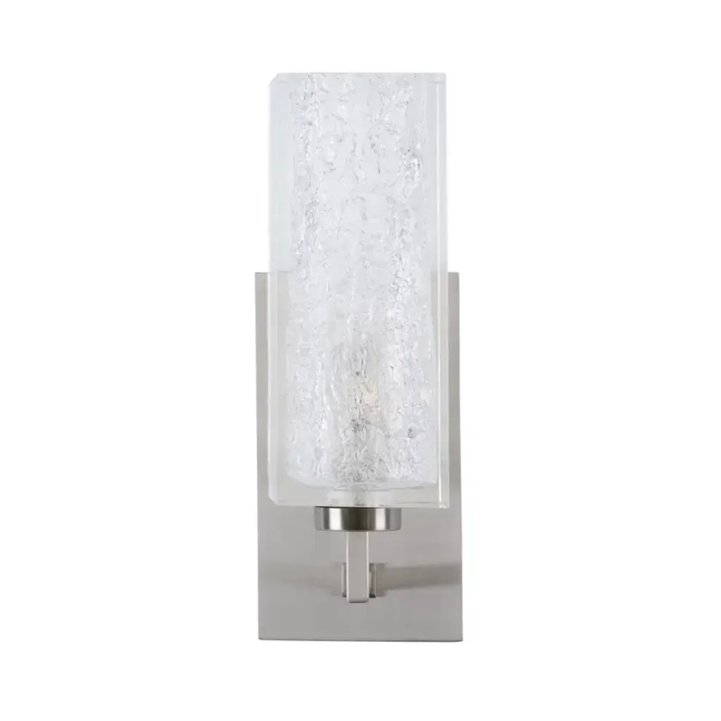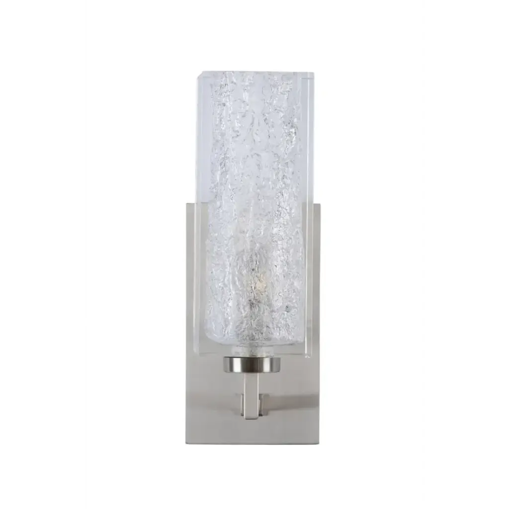 LUCALLAN SCONCE BRINGS AMBIENT LIGHT TO YOUR DESIGN WITH ITS ONE CANDLE SOCKET SET IN AN ICE TEXTURED BLOCK OF ACRYLIC. WITH ITS SATIN NICKEL FINISH, THIS MODERN WALL SCONCE WILL BE AT HOME IN HALLWAYS, BATHROOMS OR PAIRED TO FLANK A MIRROR OR PIECE OF ART.