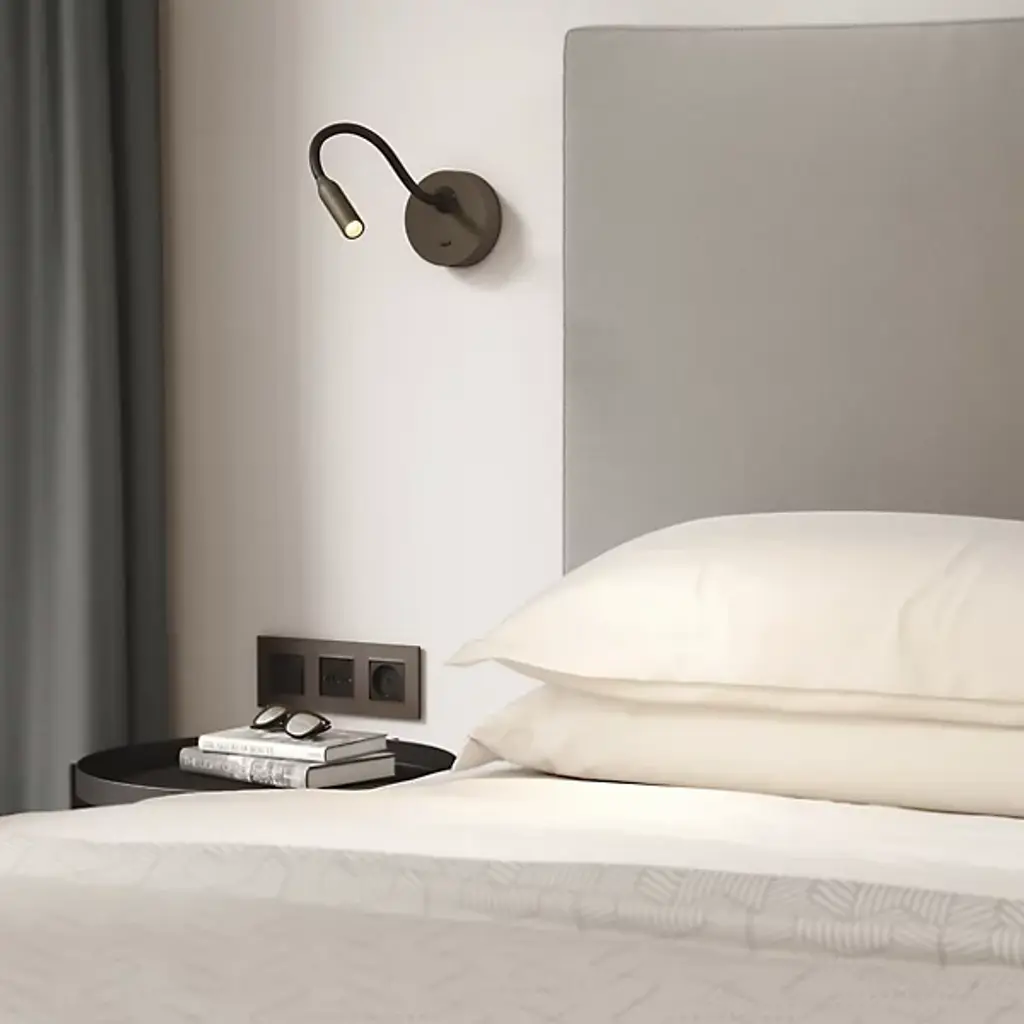 The Lucca Surface Reading Wall Sconce from Astro Lighting offers a contemporary reinterpretation of the classic gooseneck task light, featuring a flexible matte black silicone arm. This LED reader, the slimmest to date, combines a slender form with remarkable practicality. Its visual lightness is deceiving, as it houses a deeply recessed, low-glare LED and a matte-black bezel, prioritizing visual comfort. Experience the perfect blend of style and functionality with this modern update, providing efficient illumination and a sleek aesthetic for any space.