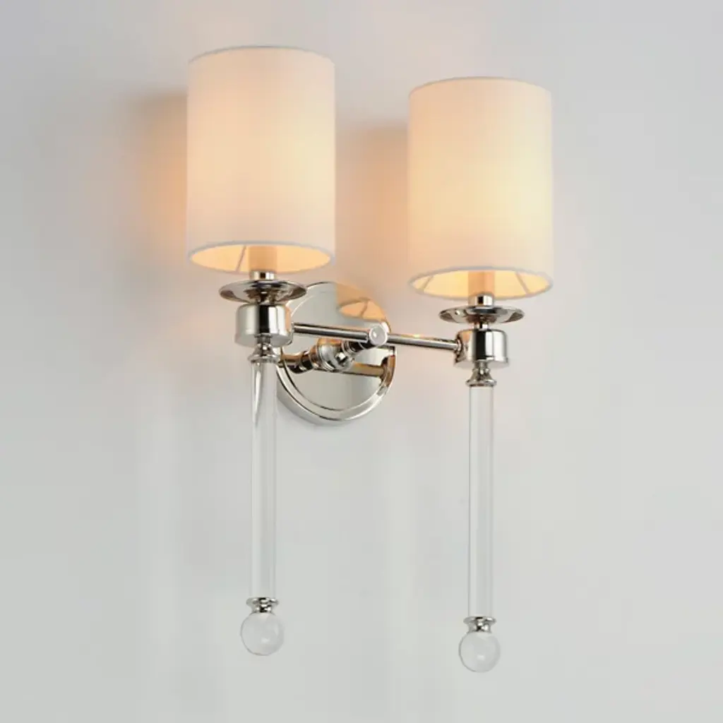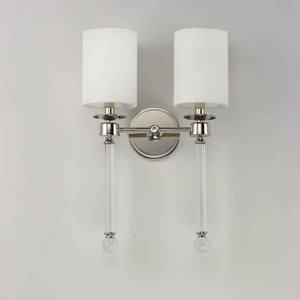 Striking the perfect balance between traditional and contemporary, the Lucent Double Wall Sconce from Maxim Lighting makes a statement in any setting. Set in place by a circular wall mount, a pair of steel arms extend forward to hold sleek metal candle holders topped with white fabric shades. Transparent tails drop below each lamp, adding a contemporary twist while remaining in a classic silhouette. Its warm incandescent light is filtered through the fabric shades to offer the room a warm and inviting glow.