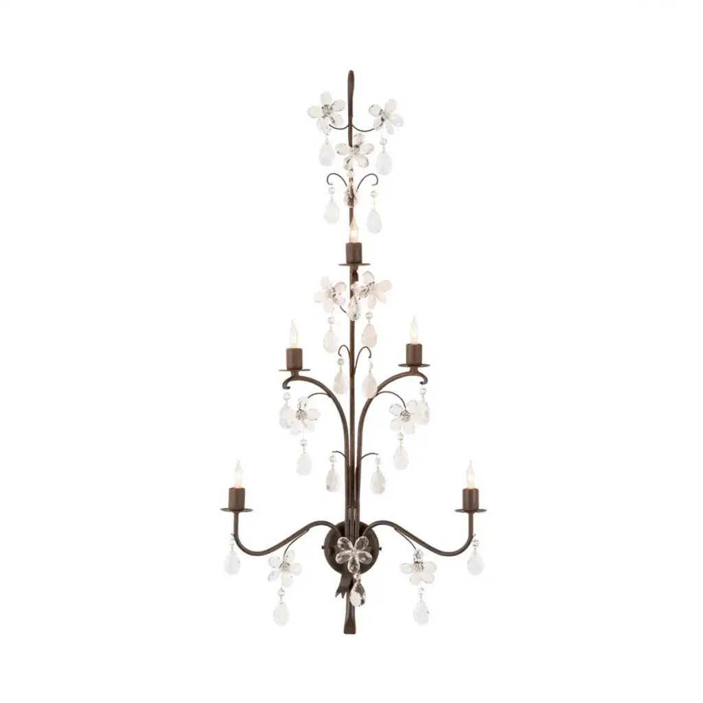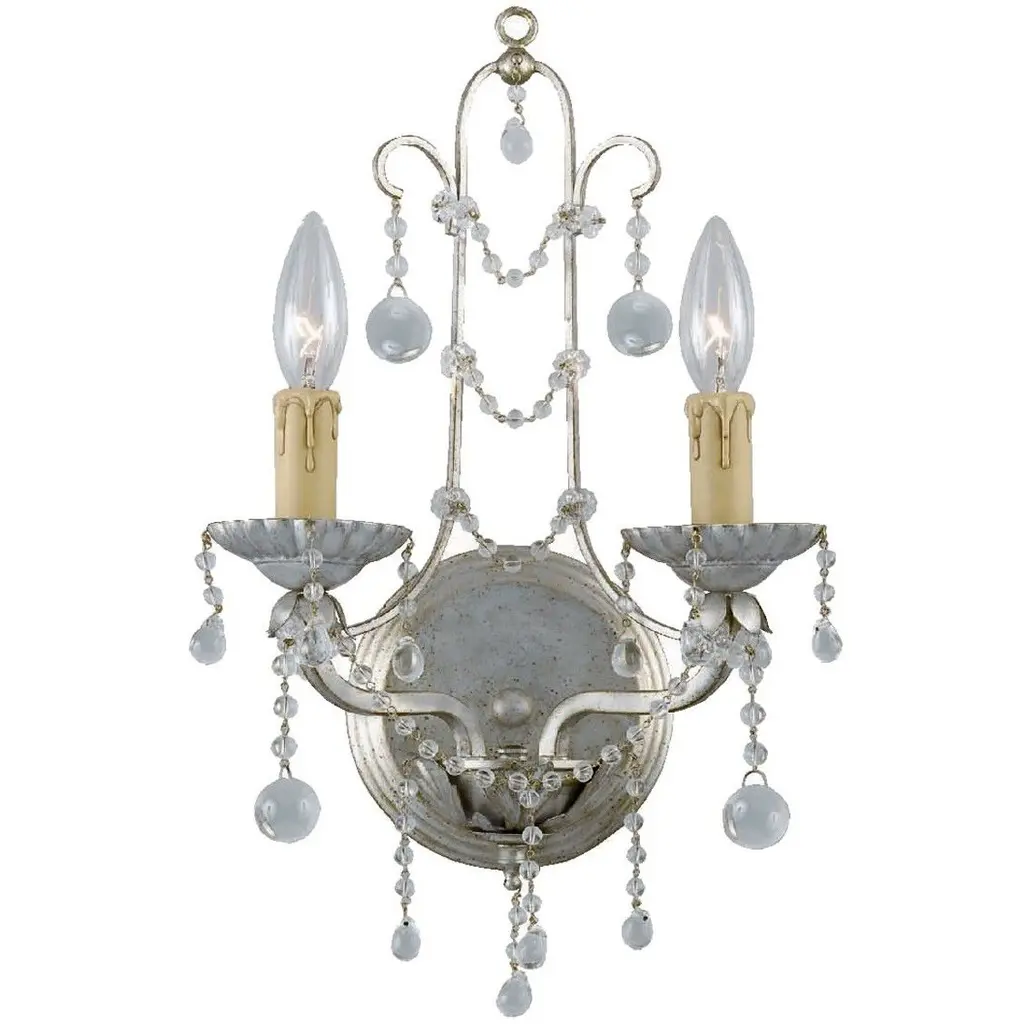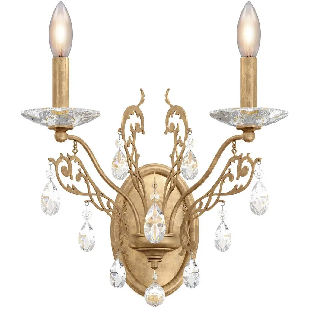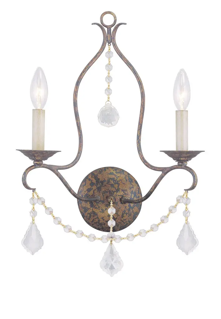 The height of elegance and design ambition, this dynamic lighting fixture becomes a central focal point in any room. Ornate detailing offers a lavish effect, making this two-light St. Regis bronze and crystal wall sconce an ideal selection.