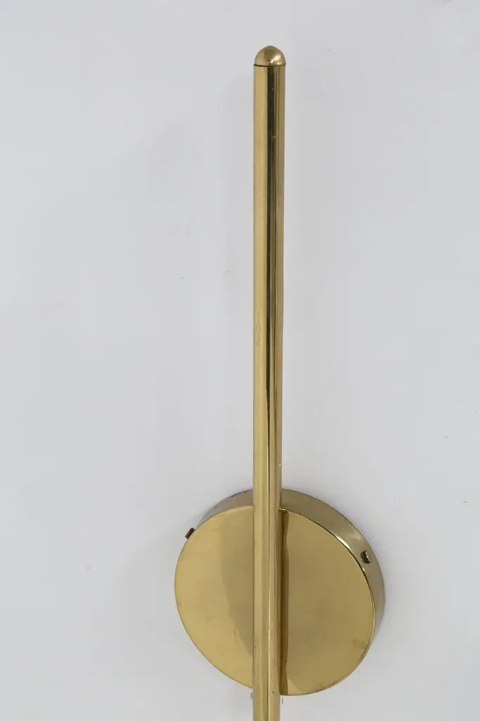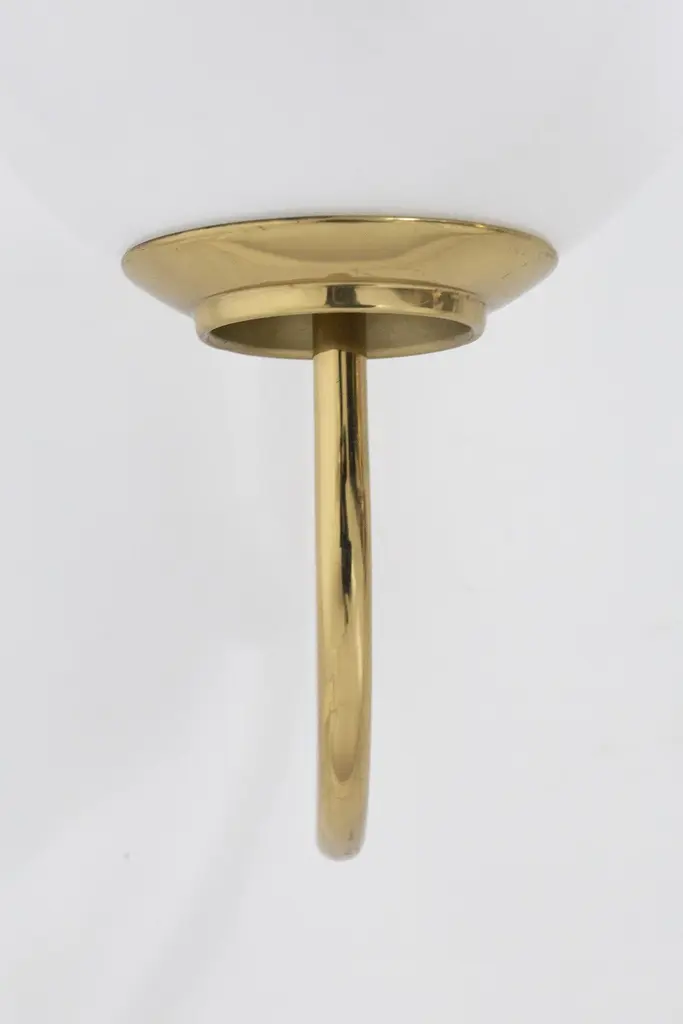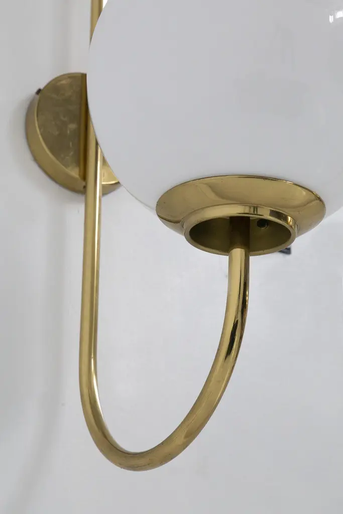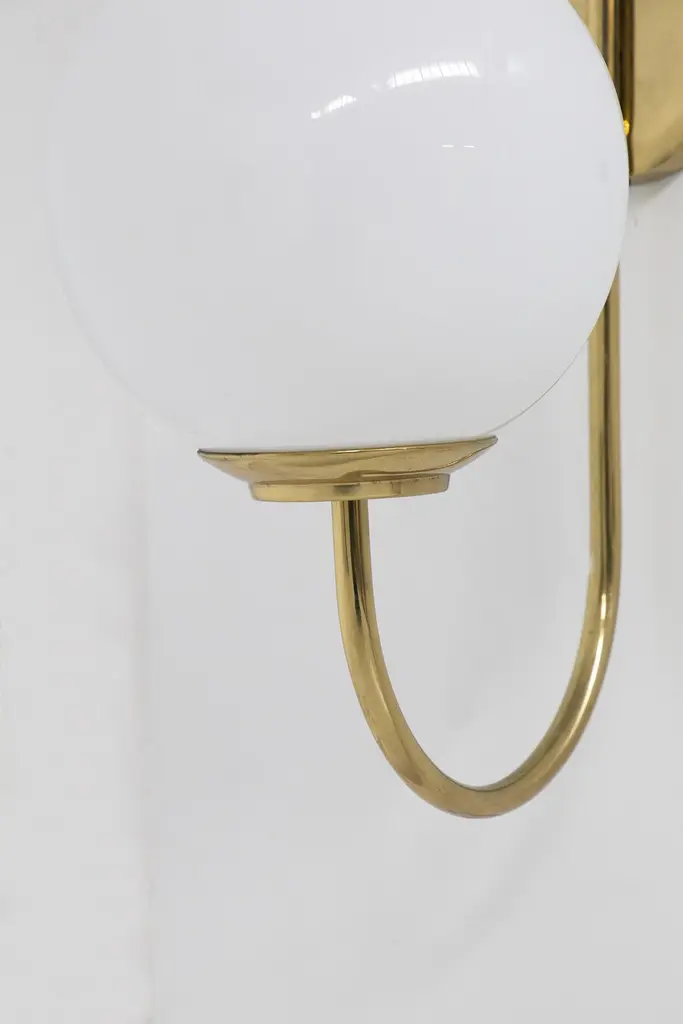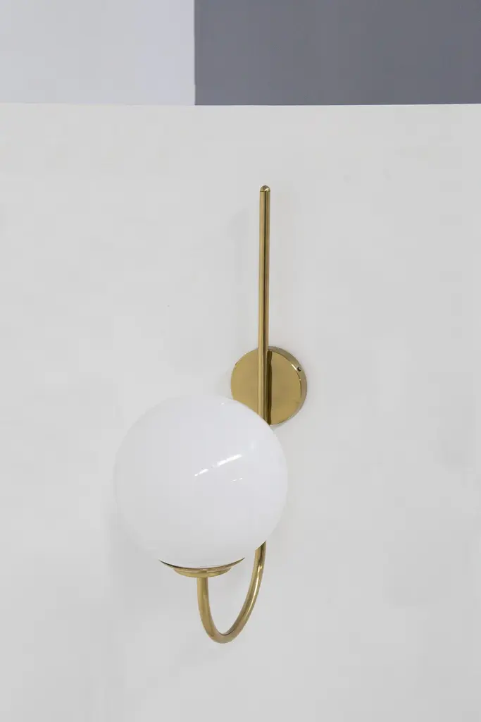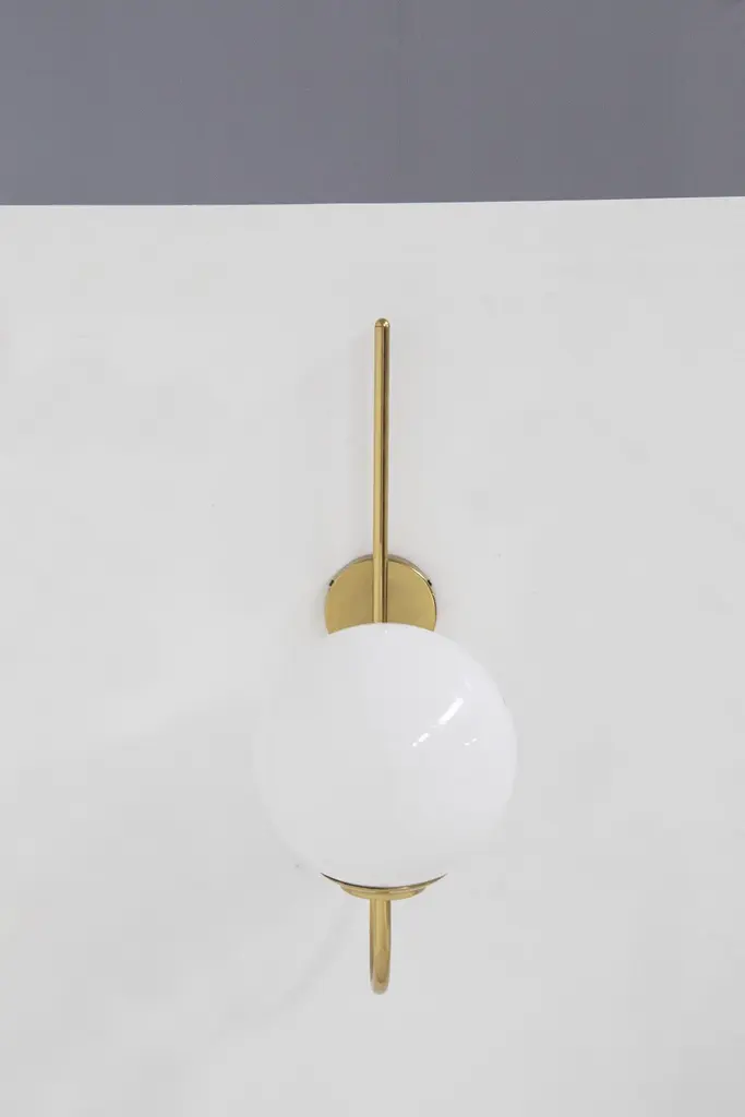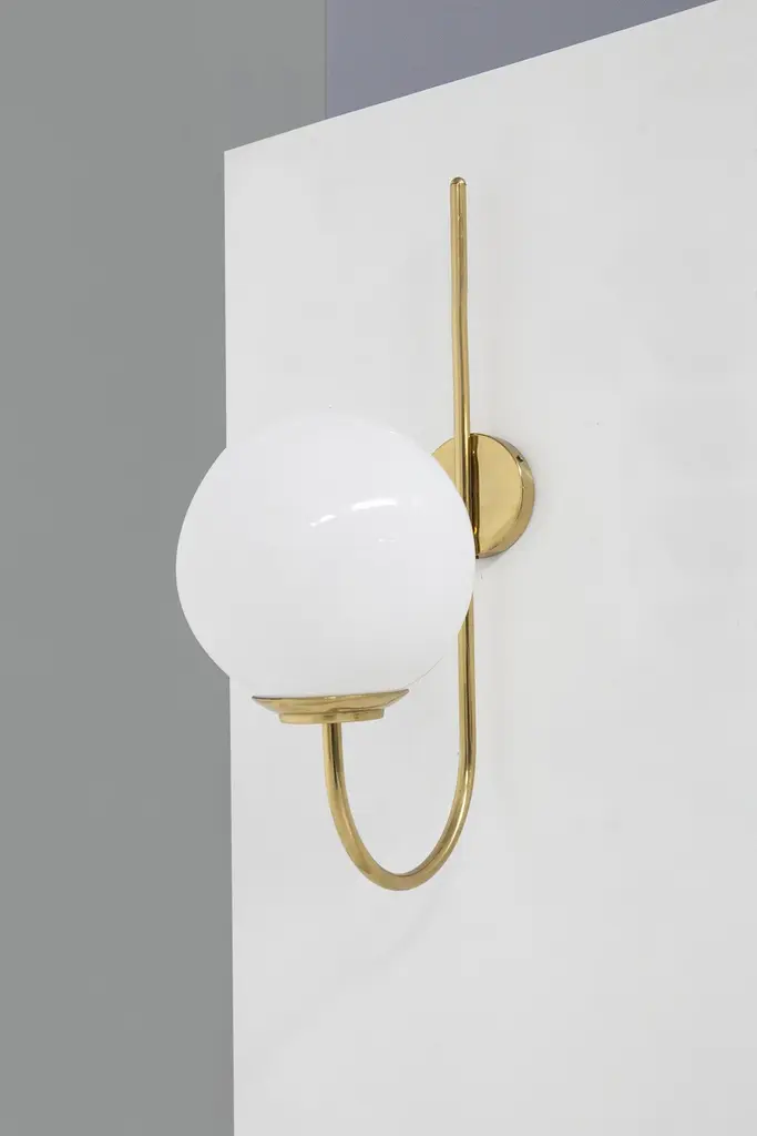 Splendid wall lamp designed by Luigi Caccia Dominioni in the 1950s for the Italian manufacturer Azucena.The wall sconce has a beautiful and shiny gilded brass stem, which is attached to the wall by means of a round plate. From this springs a thin, single brass stem, which gently curves to shape the sconce. The brass stem supports a perfectly spherical white opaque glass sphere. Strict and at the same time harmonious line that makes the object very classy.The effect is wow!The wall sconce is suitable for hallways, fireplaces or as console lighting.