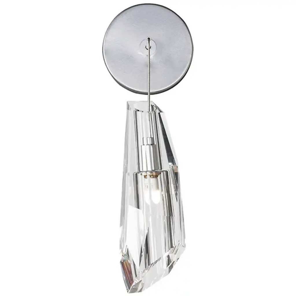 A sharp lighting look for the modern home. The Luma Wall Sconce by Hubbardton Forge is designed to dress up living areas, bedrooms, hallways and more with refined glamour. This is due primarily to its shade, a thick, abstractly faceted piece of crystal, which gives the light of the bulb within dramatic sparkle. While this wall sconce is low voltage, it does not require a separate transformer to run properly; one is already housed in the wall plate. It is crafted by hand by artisans in Vermont.