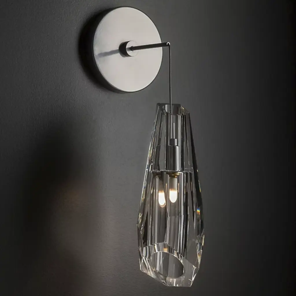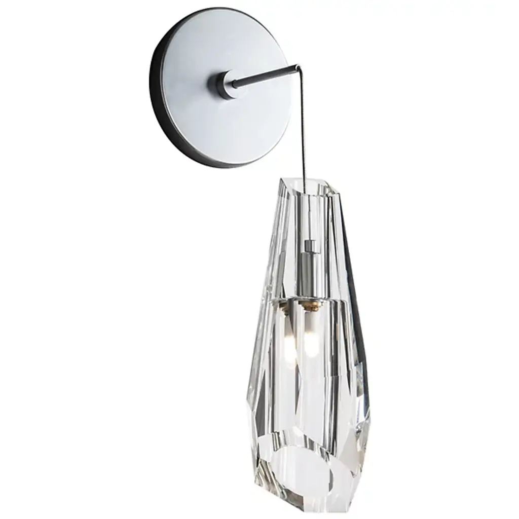 A sharp lighting look for the modern home. The Luma Wall Sconce by Hubbardton Forge is designed to dress up living areas, bedrooms, hallways and more with refined glamour. This is due primarily to its shade, a thick, abstractly faceted piece of crystal, which gives the light of the bulb within dramatic sparkle. While this wall sconce is low voltage, it does not require a separate transformer to run properly; one is already housed in the wall plate. It is crafted by hand by artisans in Vermont.