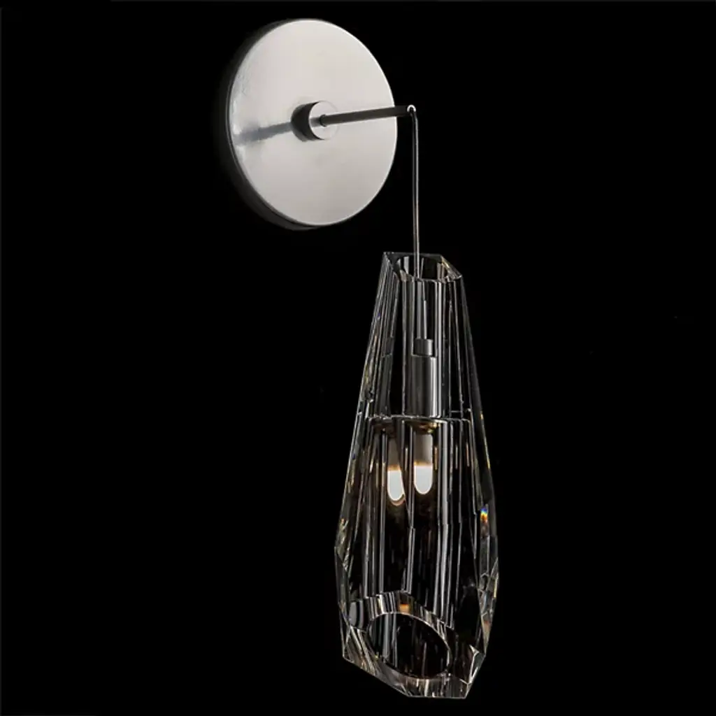 A sharp lighting look for the modern home. The Luma Wall Sconce by Hubbardton Forge is designed to dress up living areas, bedrooms, hallways and more with refined glamour. This is due primarily to its shade, a thick, abstractly faceted piece of crystal, which gives the light of the bulb within dramatic sparkle. While this wall sconce is low voltage, it does not require a separate transformer to run properly; one is already housed in the wall plate. It is crafted by hand by artisans in Vermont.