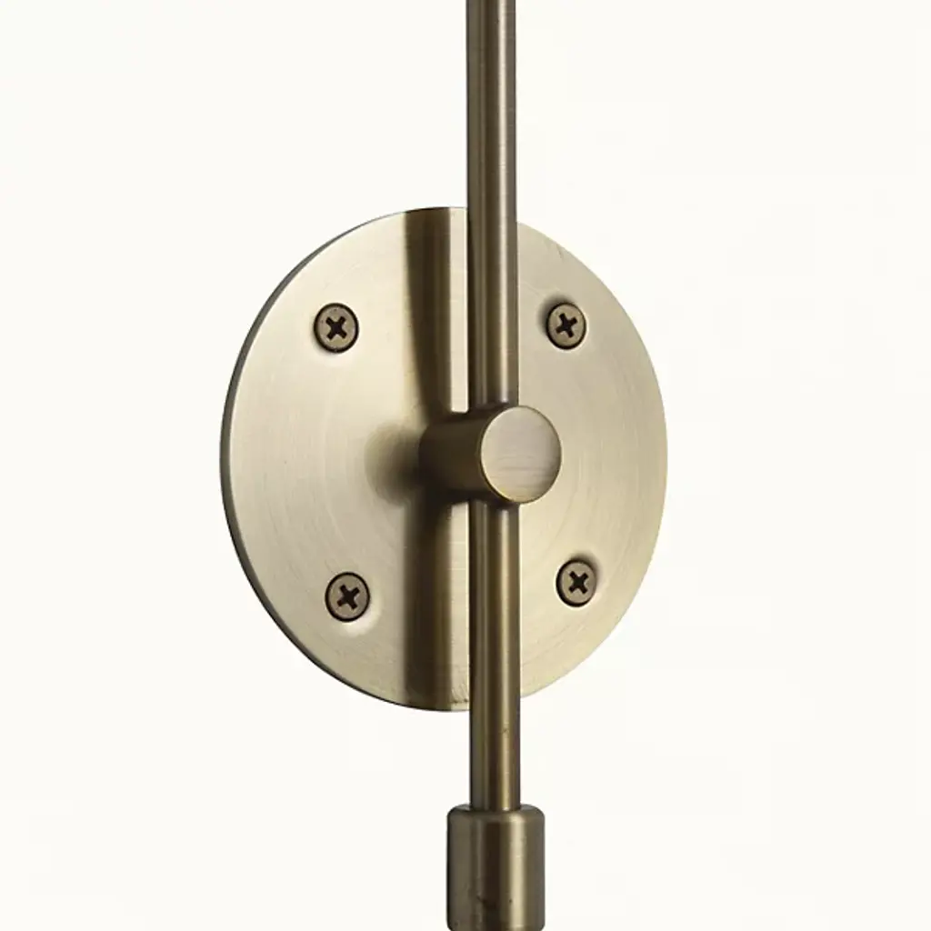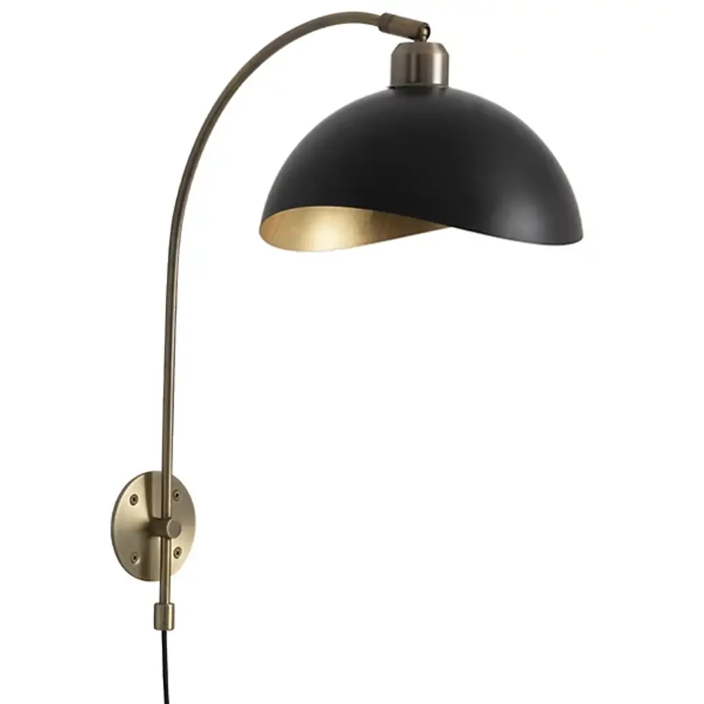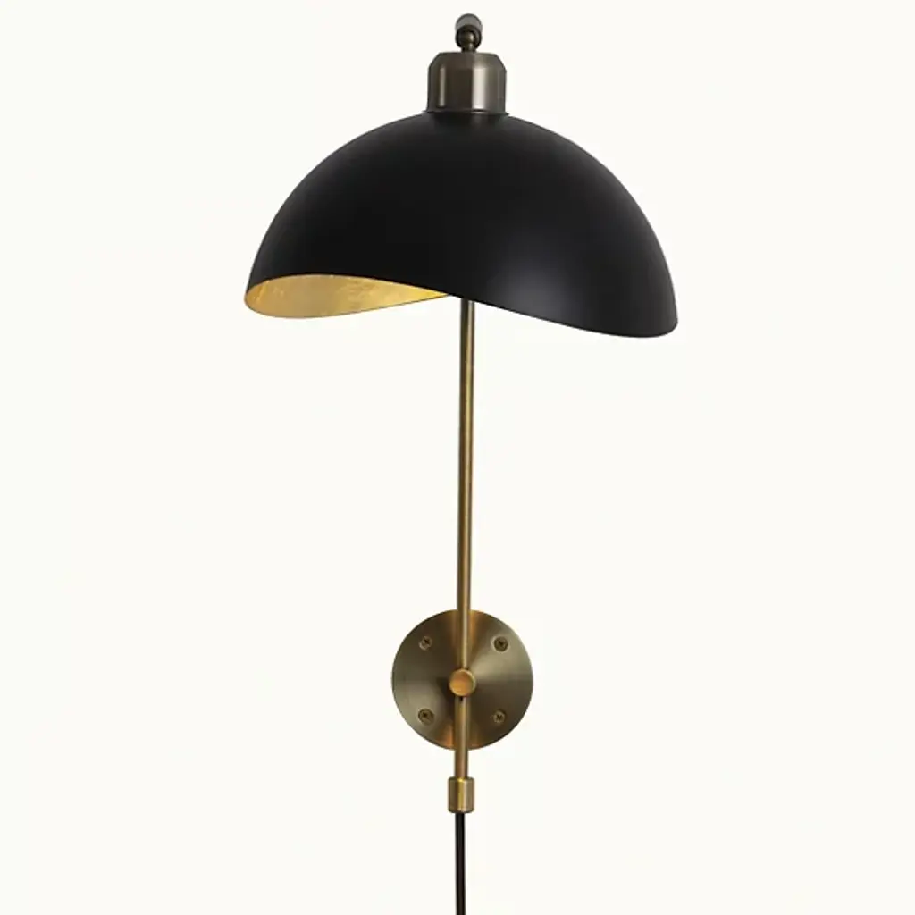 The Luna Bella Wall Sconce from Nova of California is inspired by the gentle curve of the moon on a starry night, exuding a graceful and feminine charm. This elegant design features a smoothly arched silhouette anchored by a disc wall plate. The slender steel arc and wall mount, each finished in weathered brass, extend elegantly to support a curved black shade with a gold-leaf lining, casting a warm and inviting light. Merging Contemporary and Mid-Century Modern styles, this versatile fixture complements diverse decor, showcasing exquisite craftsmanship with an enduring appeal.