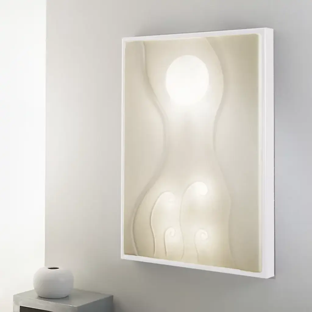 Captivating and enchanting, the Lunar Dance 1 Wall Sconce is inspired by the great mysteries of the moon. Encased in a wood frame, the structure of this modern wall sconce is made from nebulite, which is a combination of resin and fiberglass, and mimics the uneven, softly luminescent qualities of the moon's surface. Doubling as a piece of art, this decorative wall light is perfect hung in a bedroom, above a fireplace or in a dining room. Just like the light the moon casts at night, the Lunar Dance 1 Wall Sconce provides a warm, diffused, ambient light that is perfect for any space.