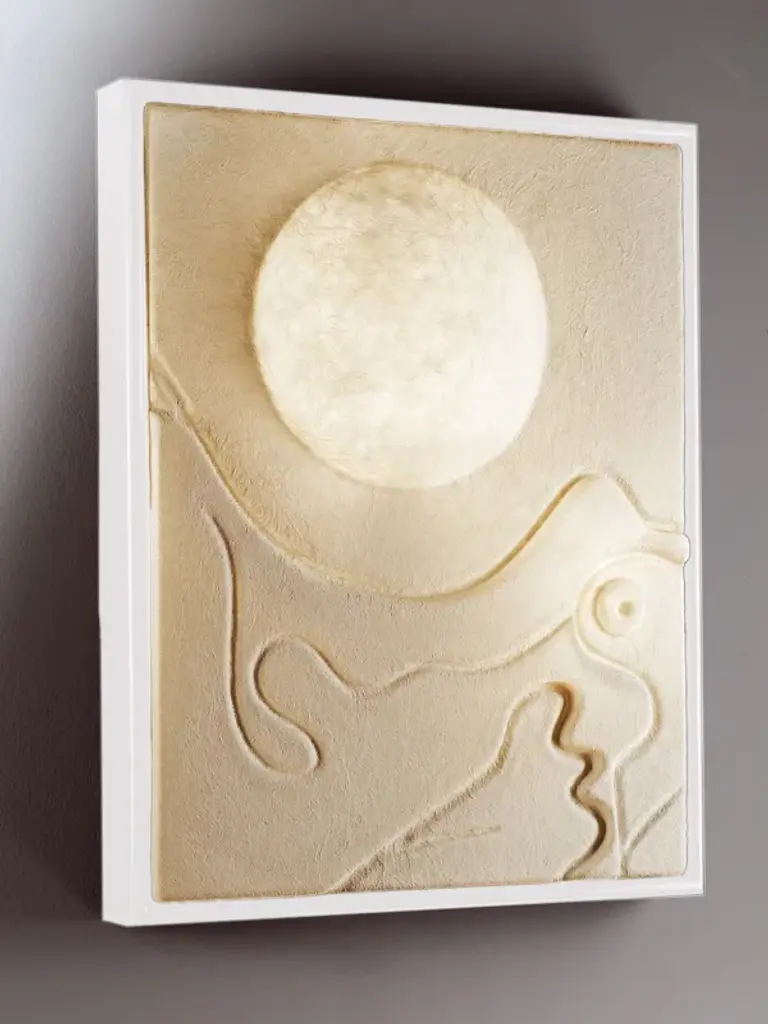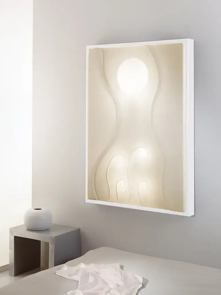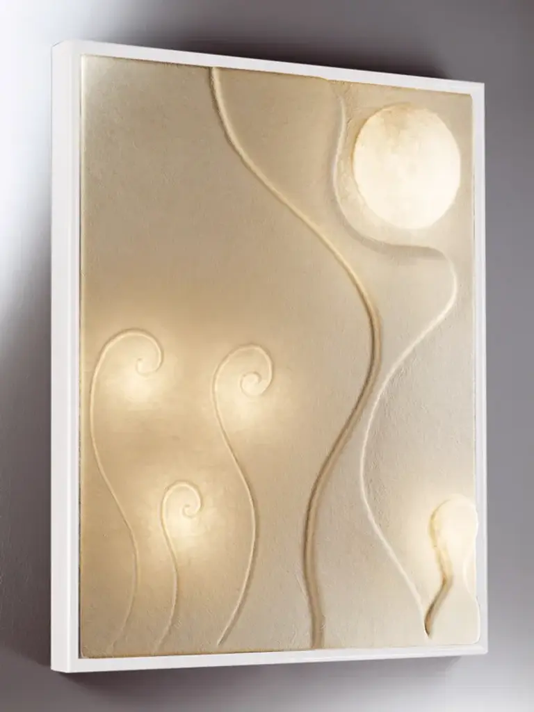 Light picture in Nebulite®. Available in black or white frame. The light picture Lunar Dance has been created from the concept of pure, atmospherical light. A highly decorative and poetic wall lamp which helps you create a soft atmosphere, thanks to its curved shapes. The “touch system” is chosen to emphasize the lamp’s functionality: in order to switch on/off the lamp, as well as change the intensity of the light, the user only has to touch the metal plate to create the desired atmosphere. The frame comes either in wenge or white. Luna (moon) collection is inspired by the moon’s mysteries. it is constructed of Nebulite, a specially developed material made of resins and fibers, that mimics the uneven, softly luminescent qualities of the moon’s surface.