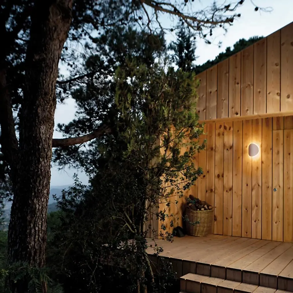 The Estiluz Lune Outdoor LED Wall Sconce keeps things simple, featuring a solid aluminum front plate that sits convex to the wall. The outer shade shields the interior acrylic diffuser, allowing light to shine freely from the top and bottom of the fixture. Suited for outdoor environments, the Lune is a great way to line the outside of a home or walkway discreetly. As a special order option only, the Lune can also be customized with laser cut signage.