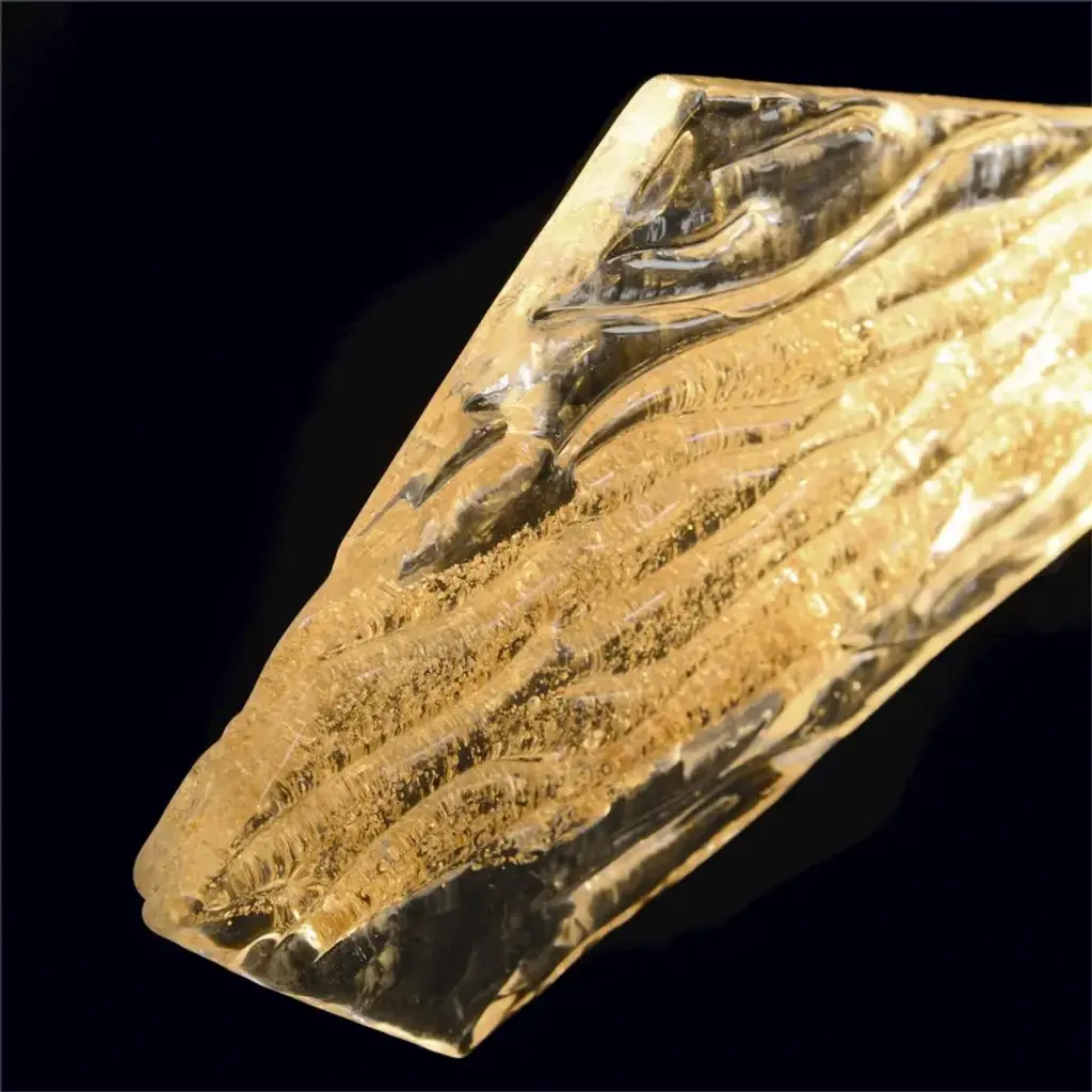 The Lux Two-Light Wall Sconce is a stunning fixture showcasing two angular cuts of seeded, mouth-blown glass held together with a metallic cuff in a Brass finish. Each of the textural glass pieces contain one bulb, beautifully diffusing the light to create a captivating ambience.
