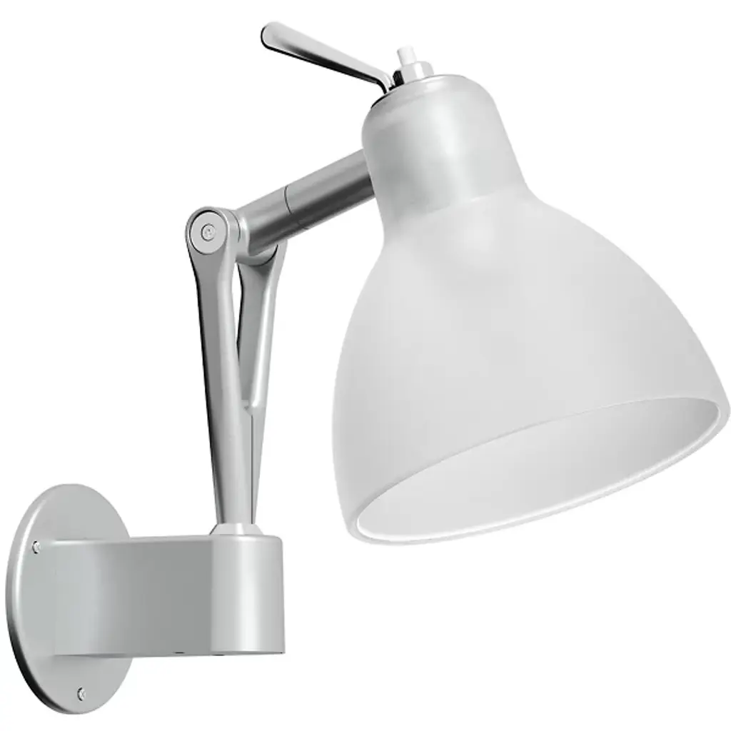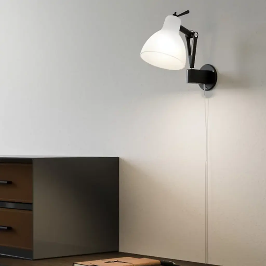A classic design comes to life in a modern finish. The Luxy W0 Wall Sconce from Rotaliana by Luminart is a sleek and highly functional piece designed by Dante Donegani and Giovanni Lauda. Its factory lamp-style shade is made of glass with a colored, glossy finish that brings a modern pop of color to its surroundings. Its pivoting arms are affixed to the wall by a circular mount, while invisible twisted springs allow for its highly adjustable positioning.