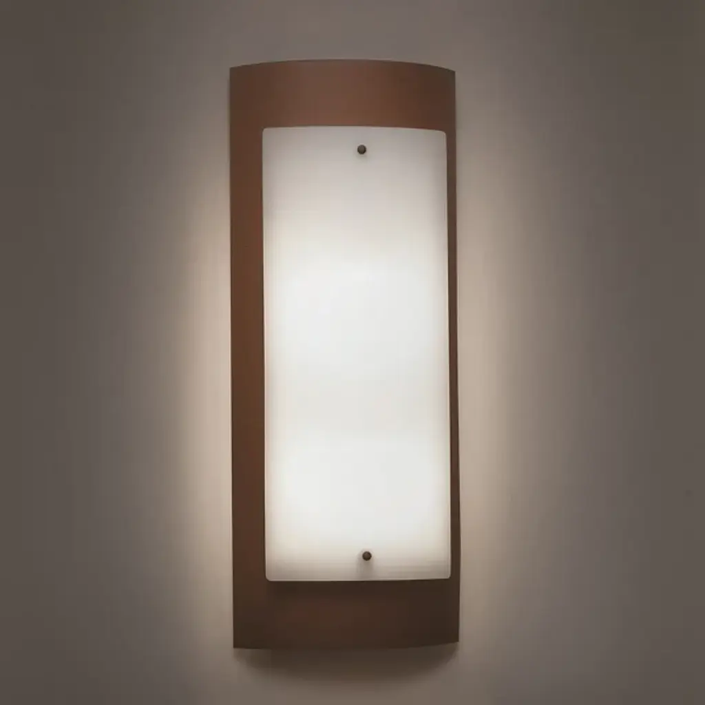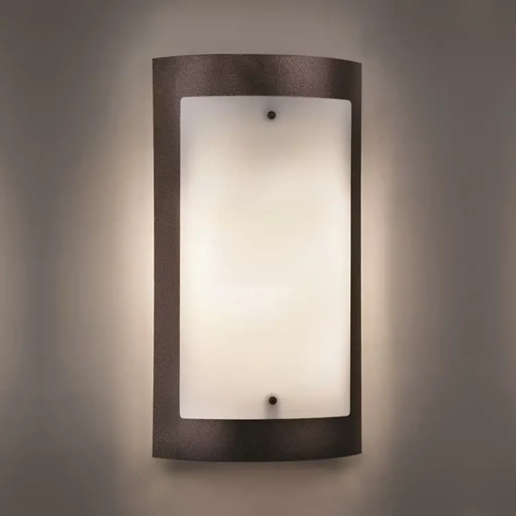 The Ultralights Luz Azul Outdoor Wall Sconce sits in a convex fashion, illuminating through an opaque diffuser. The diffuser is in front of a metal frame, secured with small hardware pieces. This wall light blends the simple shapes found in contemporary styles, with traditional finishes to satisfy anyone's taste.