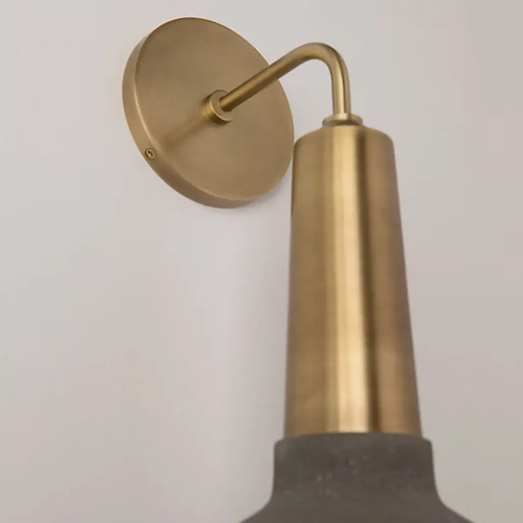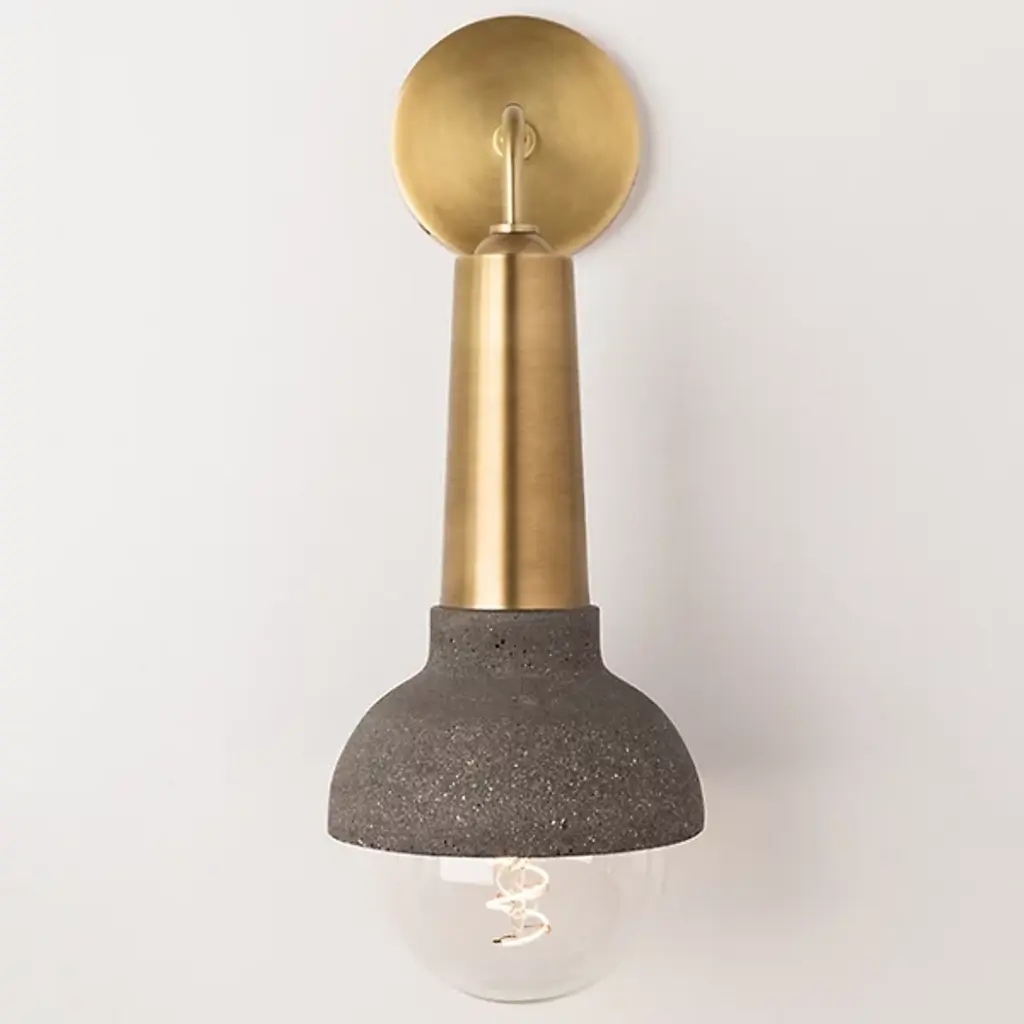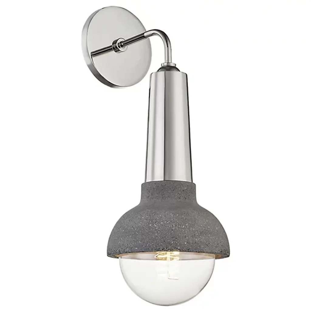 A brave vanguard transitional touch ideal for living rooms that inspire life. The Macy Wall Sconce by Mitzi is an elegant modern fixture that uses unconventional combinations of material to create an uncommon look. Made using Handworked Metal and Glass to frame, it features a striking concrete accent. The opposition between smooth Metal and rough, textured concrete creates a dynamic that grabs attention and doesn't let go. This fixture is mounted to the wall with a bent arm motif and round backplate that doesn't draw attention away. It’s a wonderful statement piece for the bold interior designer.