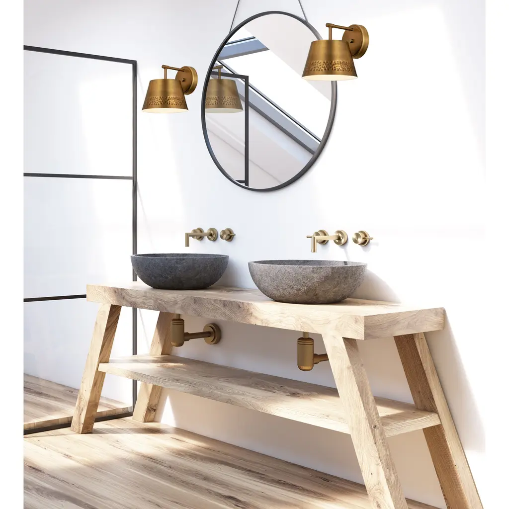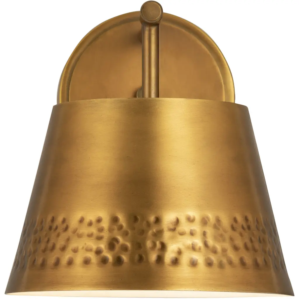This one-light wall sconce from the Maddox collection creates a seamless, easy-living look for casual spaces in need of extra lighting. Rubbed brass finish iron adds a decadent look to a sconce featuring a conical shade with a texturized hammered belt detail and matching wall mount. Dress up a bathroom or hallway space with this elegant light that incorporates farmhouse and industrial motifs.