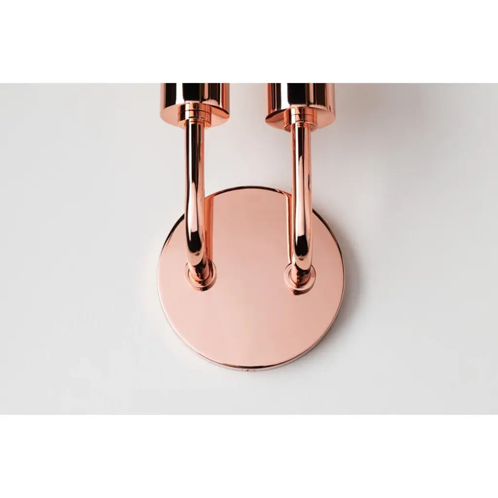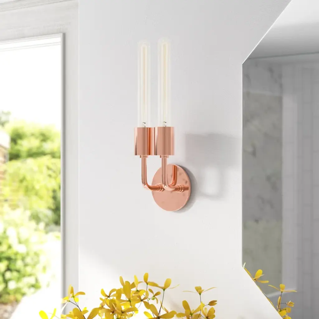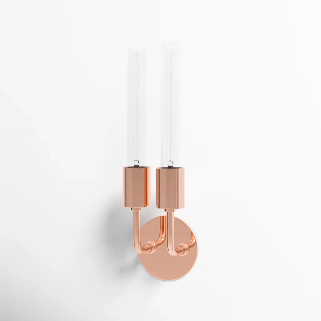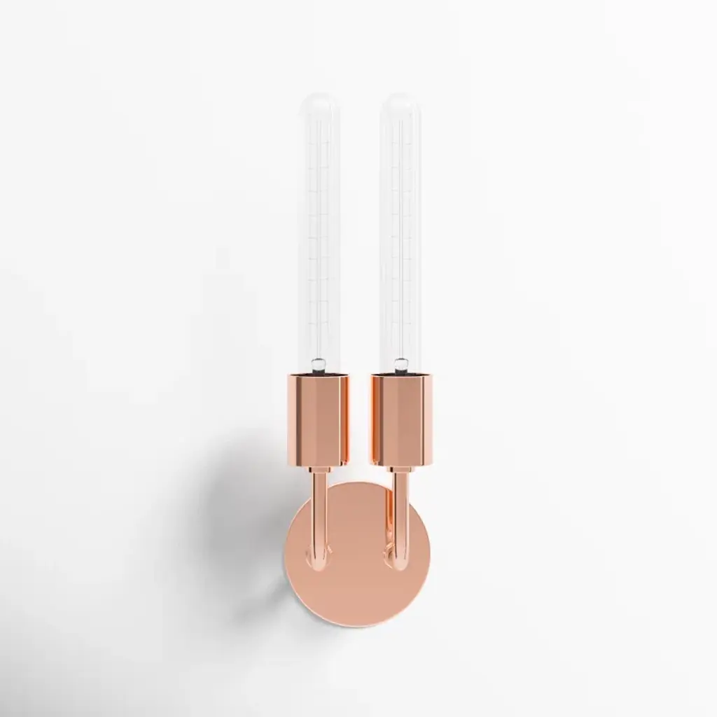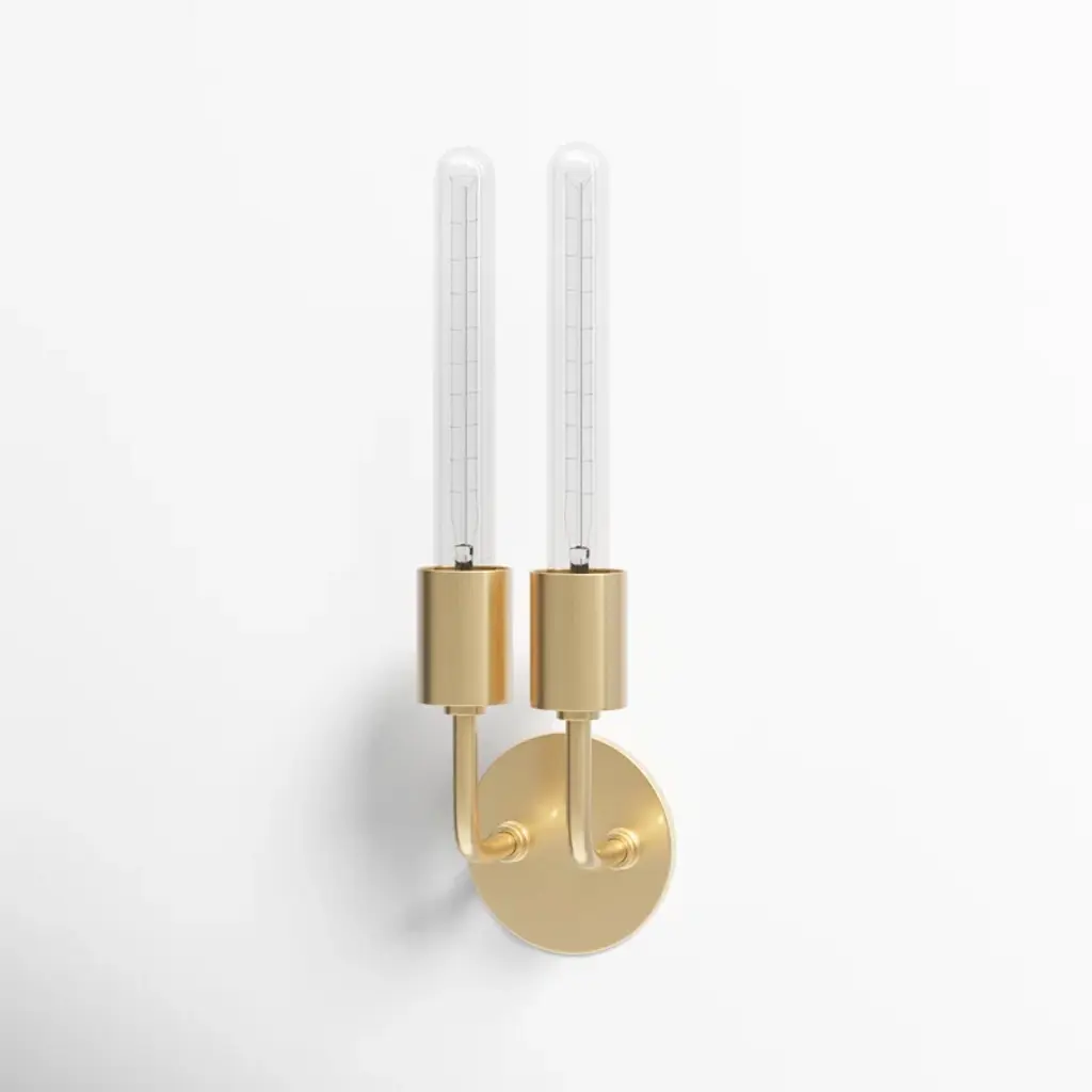 This dimmable armed sconce elevates its bare-bulb minimalism with polished details and an unexpected silhouette. Crafted from metal, its circular backplate and curved arms hold out two elongated tubular bulbs (included). It’s suitable for damp spaces + mounts facing either direction.