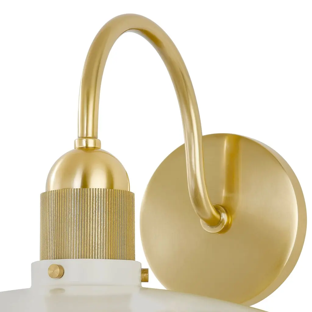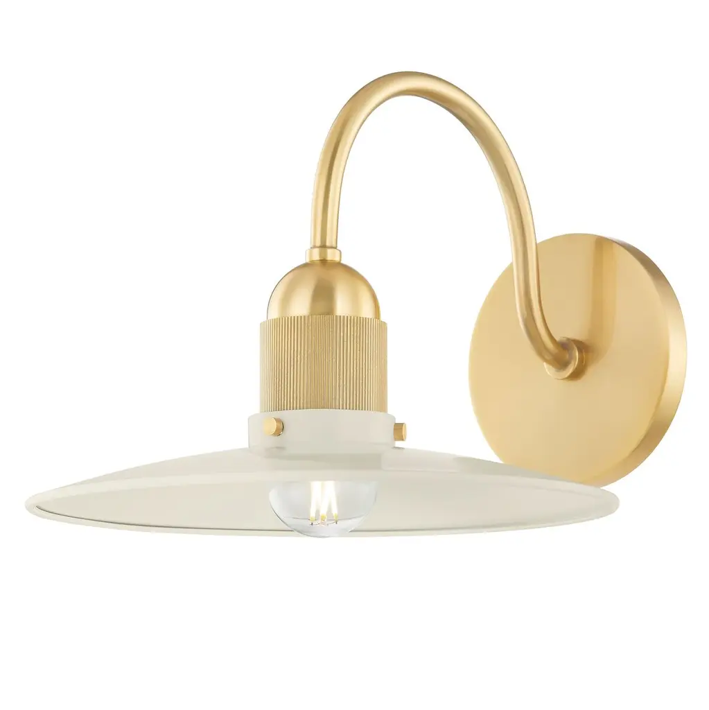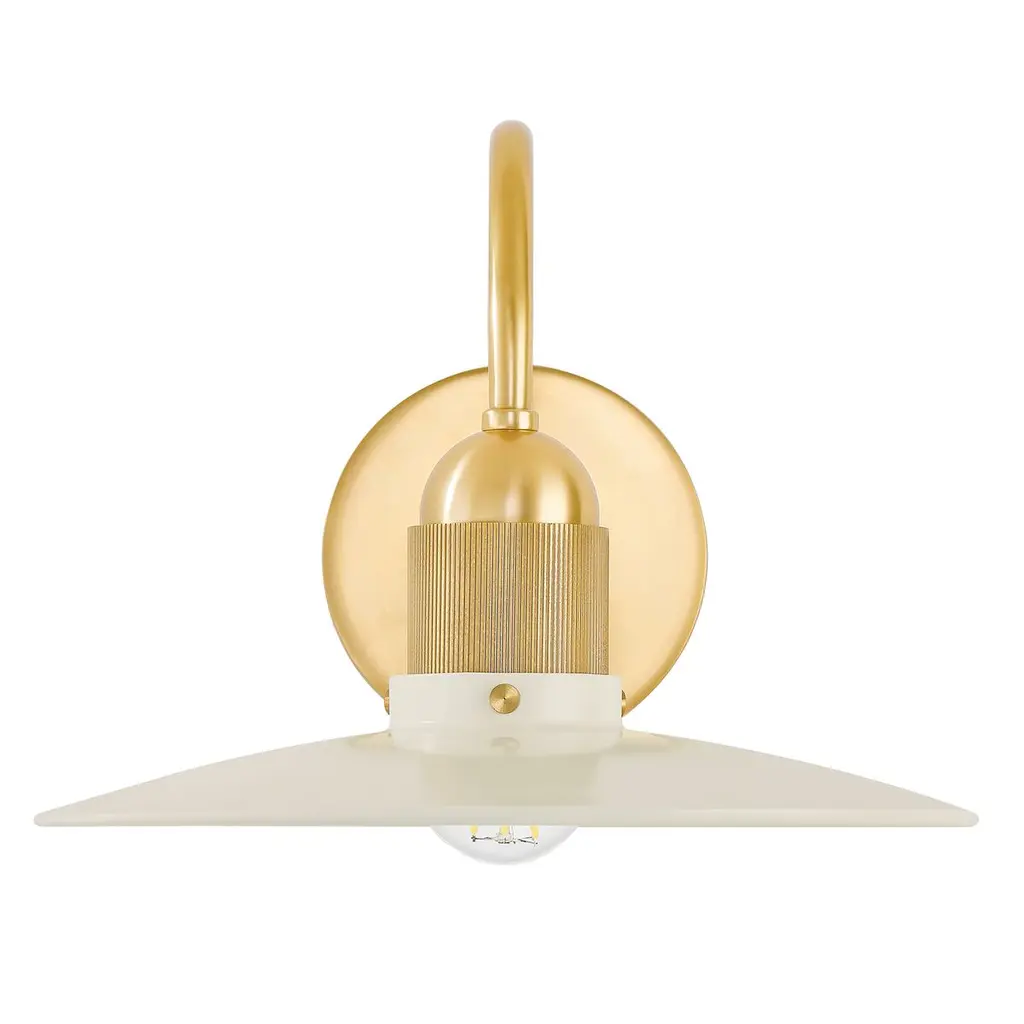 A beautifully modern take on the farmhouse wall sconce, this piece features a very slim reflector shade. Deliberate space between the shade and socket cup allows light to shine on the knurled detailing above as well as reflect off the shade itself. The sconce brings a modern mood to any wall. Matching pendant available.