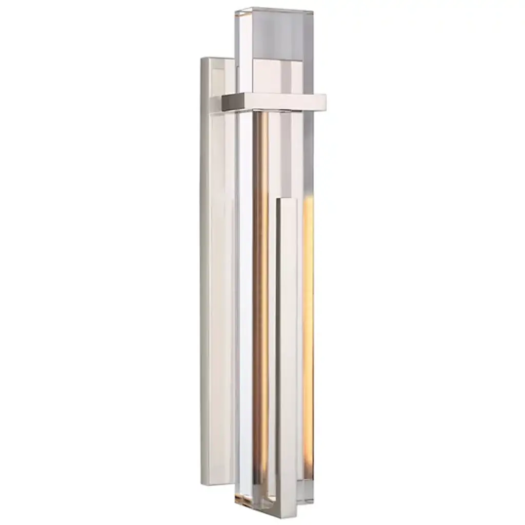 The Malik LED Wall Sconce from Visual Comfort Signature, formerly known as Visual Comfort, steps up the aesthetic complexity of the contemporary home with soft, scattering light across elegant geometry. This sconce’s picture-perfect shapes line up with key features like columns, entryways, and framed pictures. It sits against the wall with a low-profile metal backplate. Linear metal accents brace the diffuser with a sleek edge. The diffuser contrasts against the metal to enhance the overall graphic look of the piece. Light streams from top to bottom as a warm architectural glow.