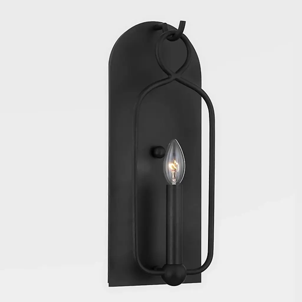 A stylish modern piece that makes a statement when introduced to the walls of your home. The Mallory Wall Sconce from Mitzi is made of smooth metal throughout and features a rectangular base with a rounded top that ends with a brief hook. An arrangement of thin metal lines swoop and gracefully curve, holding a single crisp bulb as it hangs on the hook. The light is bright and even, spreading with ease over the space.