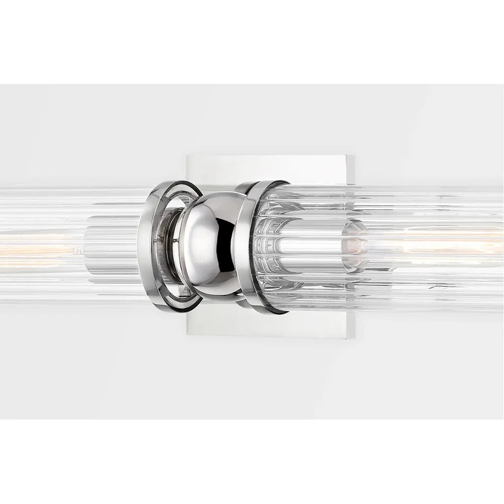 Malone's metal-ringed, blown borosilicate glass shades are open at the top and at the bottom allowing light to pour through above and flow through below, where it reflects beautifully off the metal ball at the center of the fixture. The clear ribbed glass shows off the filament bulb details of this extremely versatile, go-anywhere, go-with-anything sconce. Double sconce can be mounted horizontally or vertically.