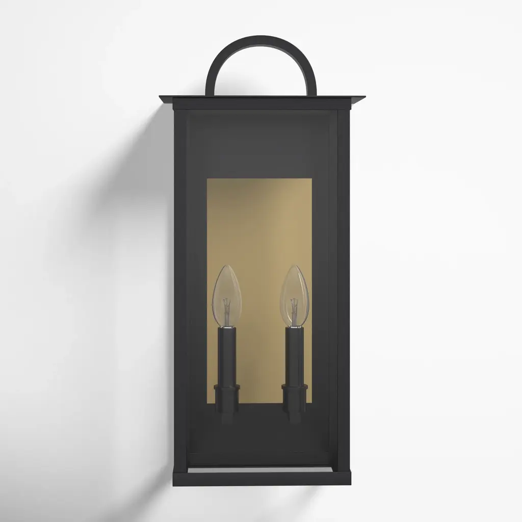 The Manchester series is inspired by classic coach lanterns and consists of minimally extended sconces in a variety of sizes that have been modified with simplified embellishments. The black frames have been modified with a squared arc handle and a contrasting Burnished Gold plate that reflects clusters of candle lights surrounded by Clear glass panels. This collection references historic exterior sconces while modernizing their appearance. Complement the design with tubular lamps to accentuate the verticality of the frames.