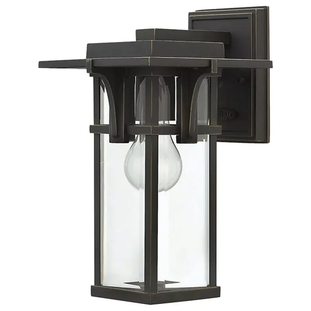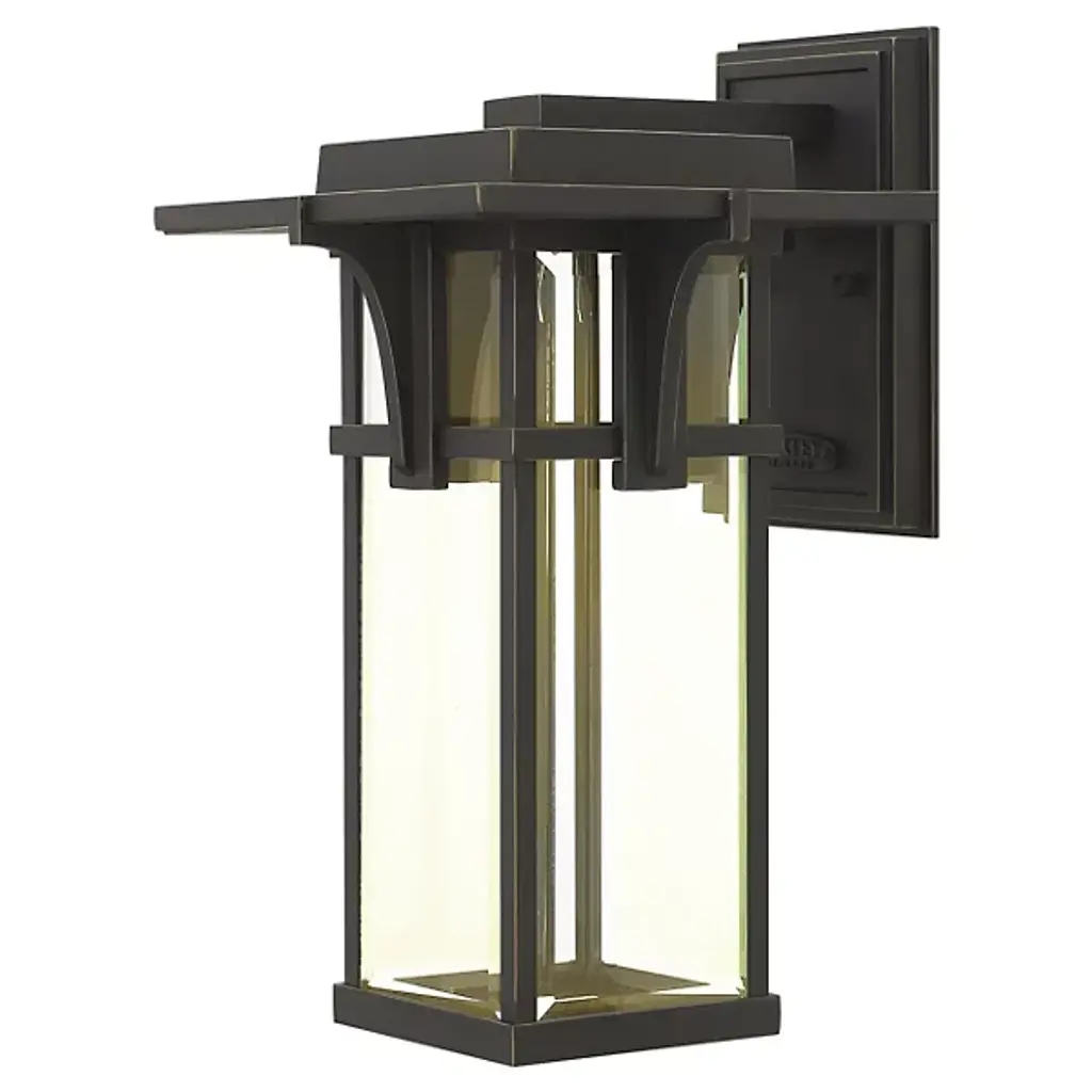 A transitional twist on a vintage lantern design. The classy Manhattan Outdoor Wall Sconce by Hinkley Lighting features a tiered aluminum frame finished in Oil Rubbed Bronze surrounding a clear beveled glass shade. Inside is an otherwise exposed light source (available in different options) which supplies a well-defined, robust light to the area.