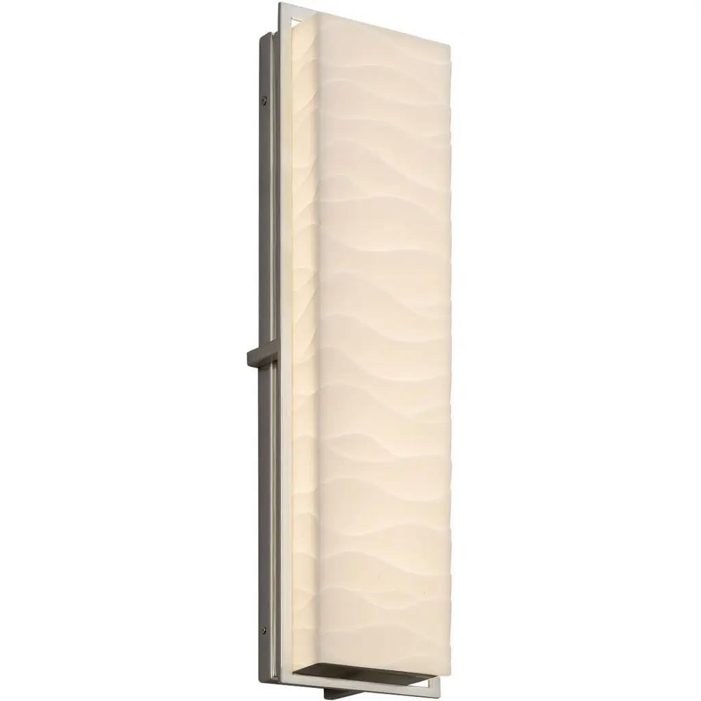 An undulating shape softly curls along its center to create an organic form constructed of a single panel of transparent acrylic. Further enhancing the form is the captivating effect of the frosted band around the borders and the patterned etching on the acrylic that captures the light. A coordinating wall sconce that features the same curled acrylic material and extends only 4 inches from the wall for ADA compliant applications.