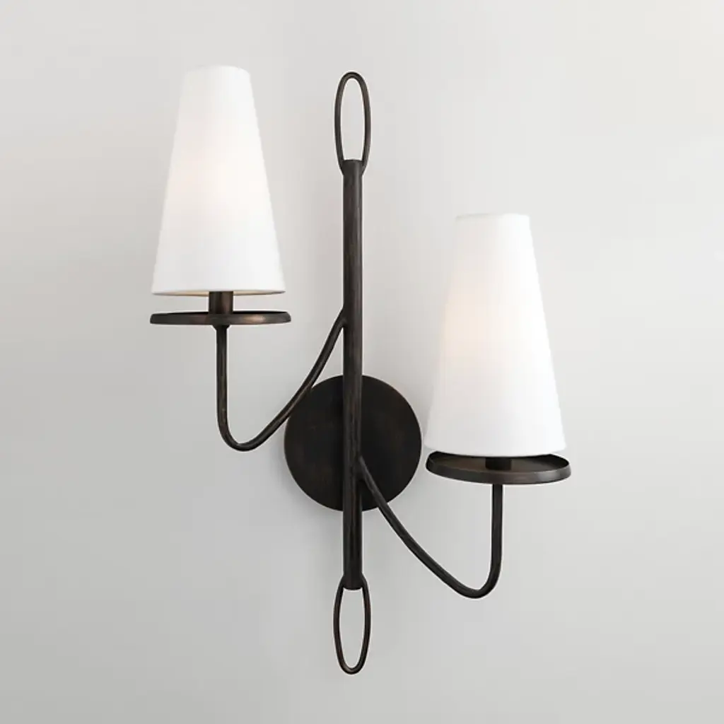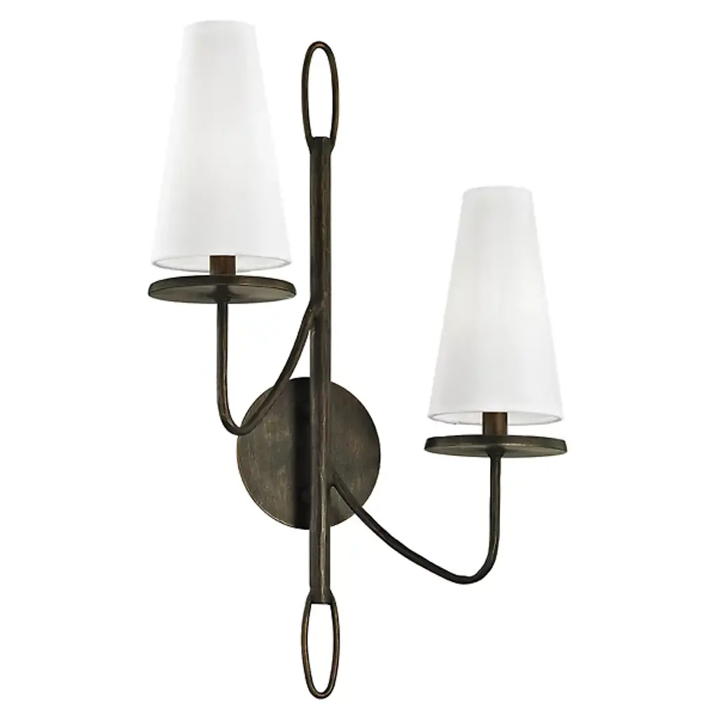 A subtle accent light inspired by minimalist modern architecture, the contemporary Marcel 2-Light Wall Sconce by Troy Lighting creates a strong visual effect with its pronounced lines and forms. Framed using handworked Iron with a rough finish, this fixture features a long tapered shade in Cotton that nearly connects with a small round base accent. The light effect created is muted and targeted, making it a great selection for bedsides.